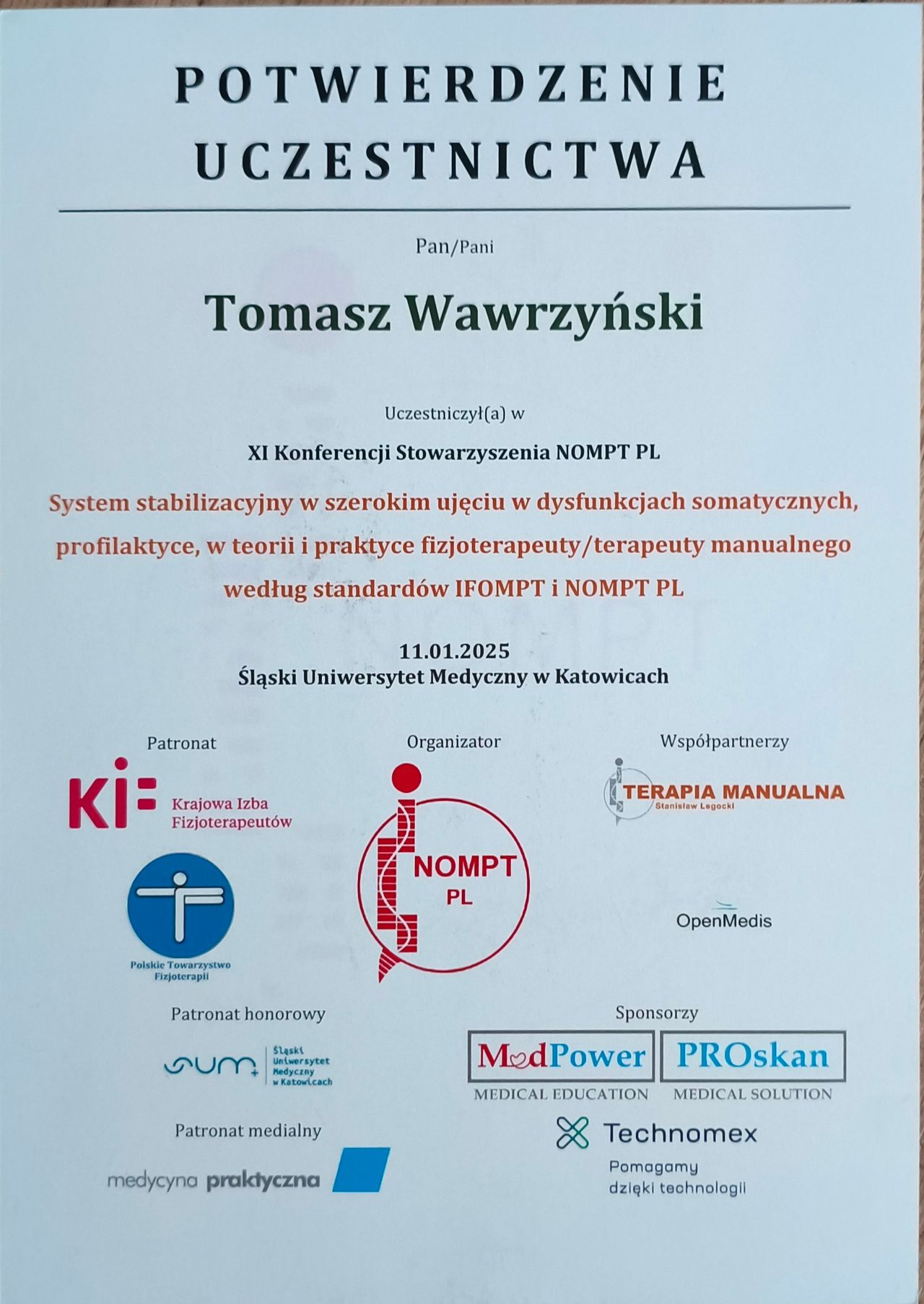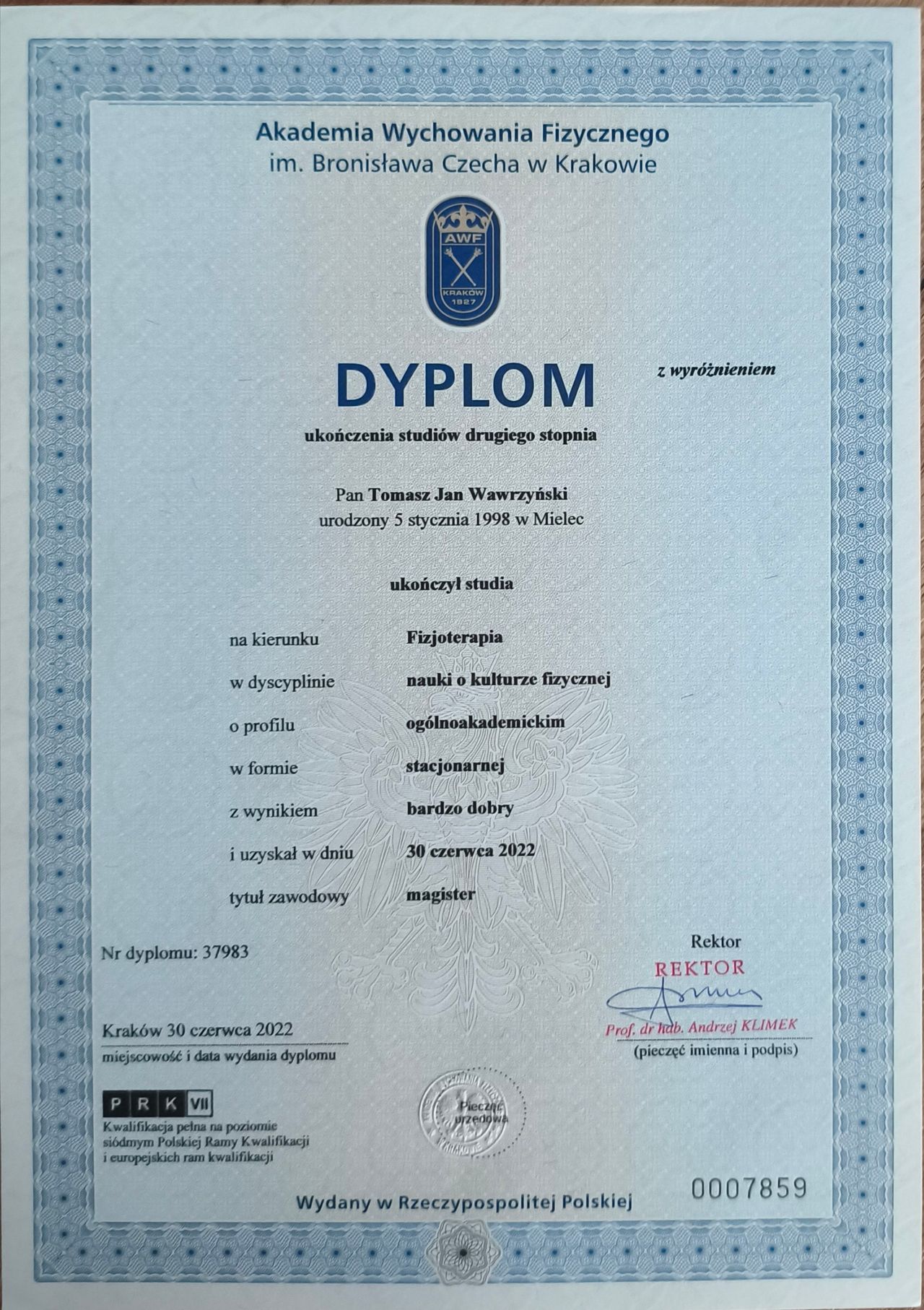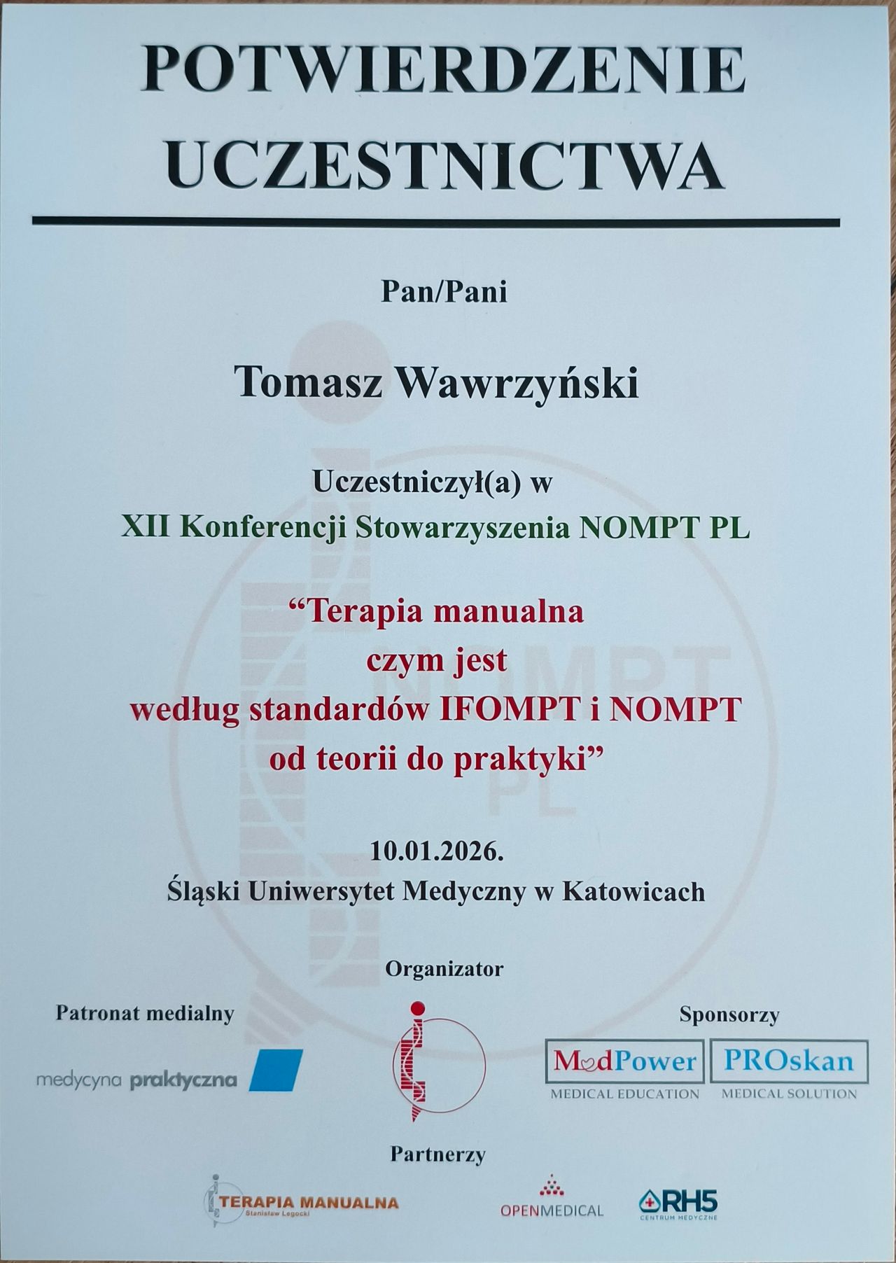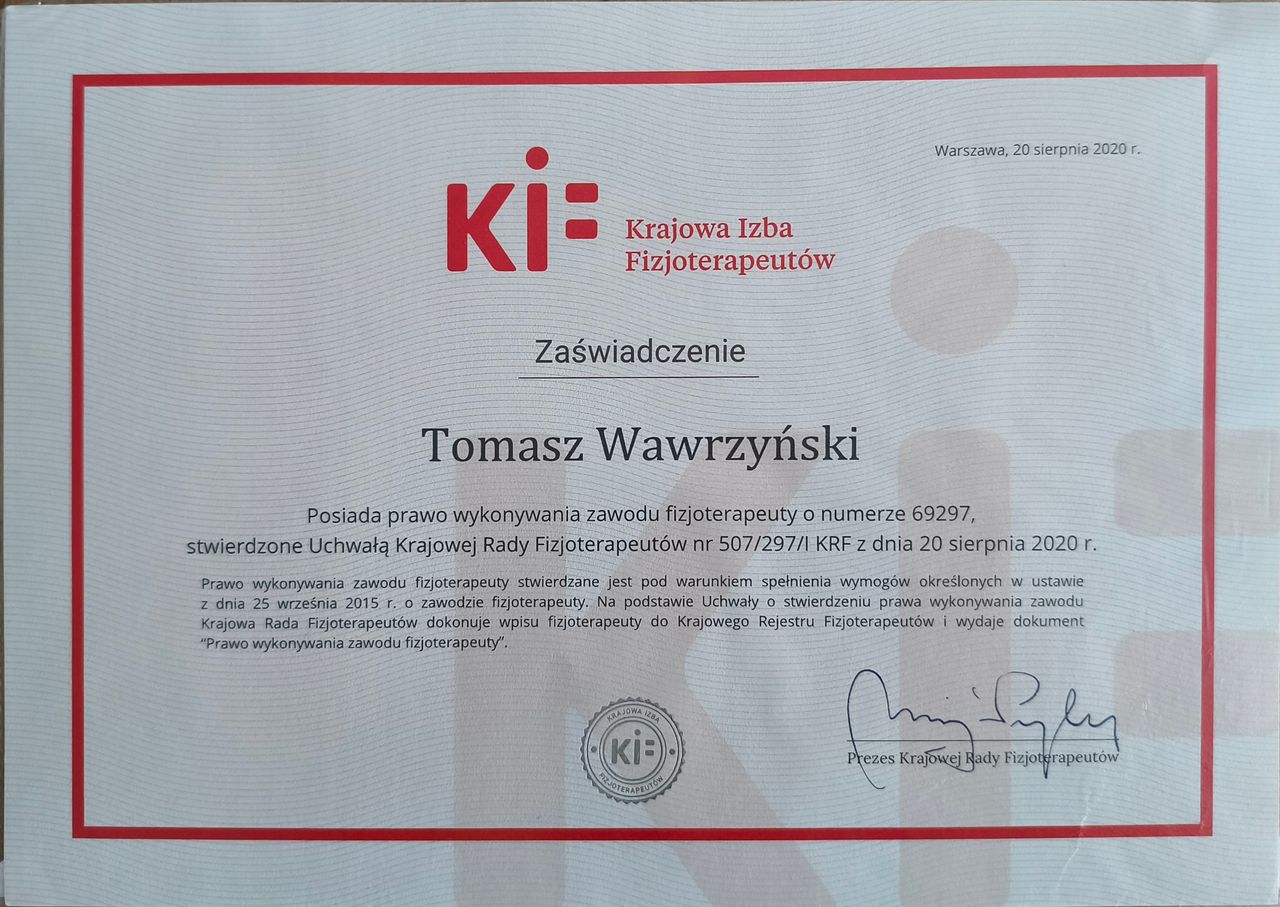 Nazywam się Tomasz Wawrzyński. Jestem Fizjoterapeutą, Terapeutą Manualnym z kilkuletnim doświadczeniem. Miałem przyjemność pracować z pacjentami z każdej grupy wiekowej, z wieloma różnymi schorzeniami, co pozwoliło znacznie poszerzyć moją wiedzę i umiejętności. W mojej terapii skupiam się głównie na precyzyjnej diagnostyce problemu, żeby skutecznie usunąć przyczynę dolegliwości pacjenta, a nie tylko skutek. Zawsze staram się sprostać oczekiwaniom pacjenta oraz dokładnie wysłuchuje jego potrzeb. Staram się dokładnie tłumaczyć przyczynę danych zjawisk i cel naszej terapii. Edukacja pacjenta jest dla mnie bardzo ważna, dlatego nie wypuszczam z gabinetu pacjenta bez odpowiedzi na jego pytania - oczywiście jeśli czegoś nie wiem, staram się dowiedzieć, bądź pokierować w odpowiednie miejsce.