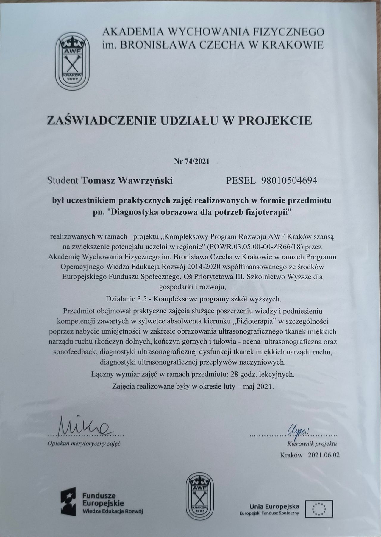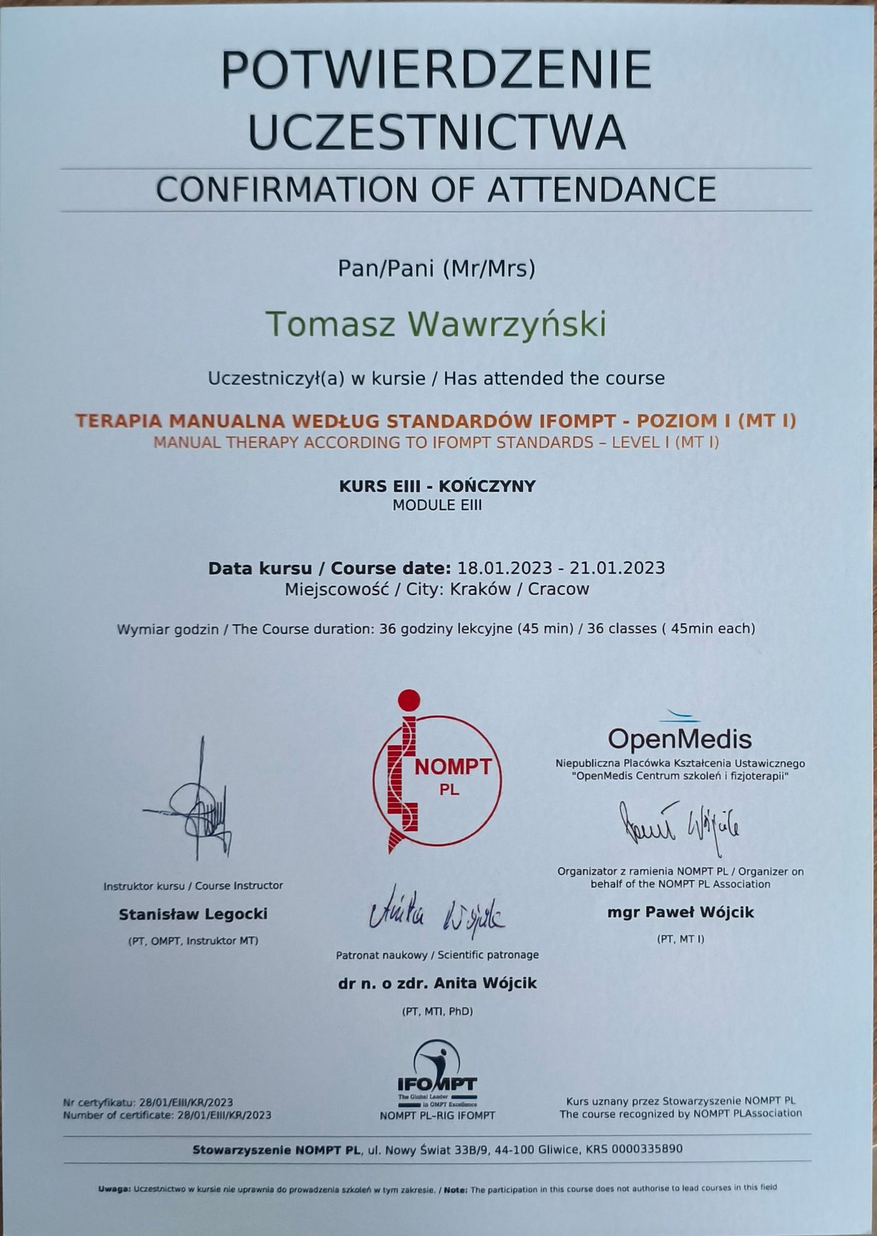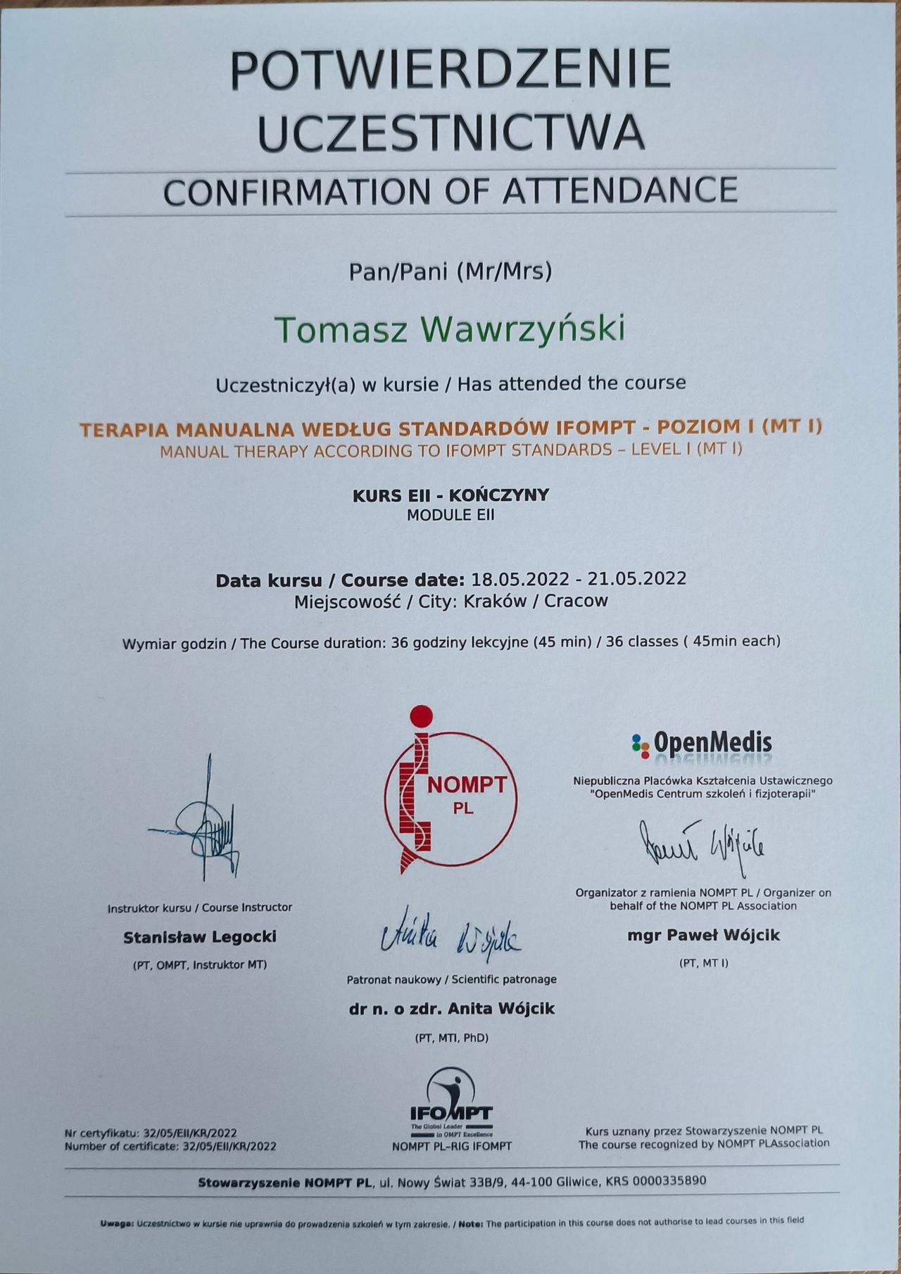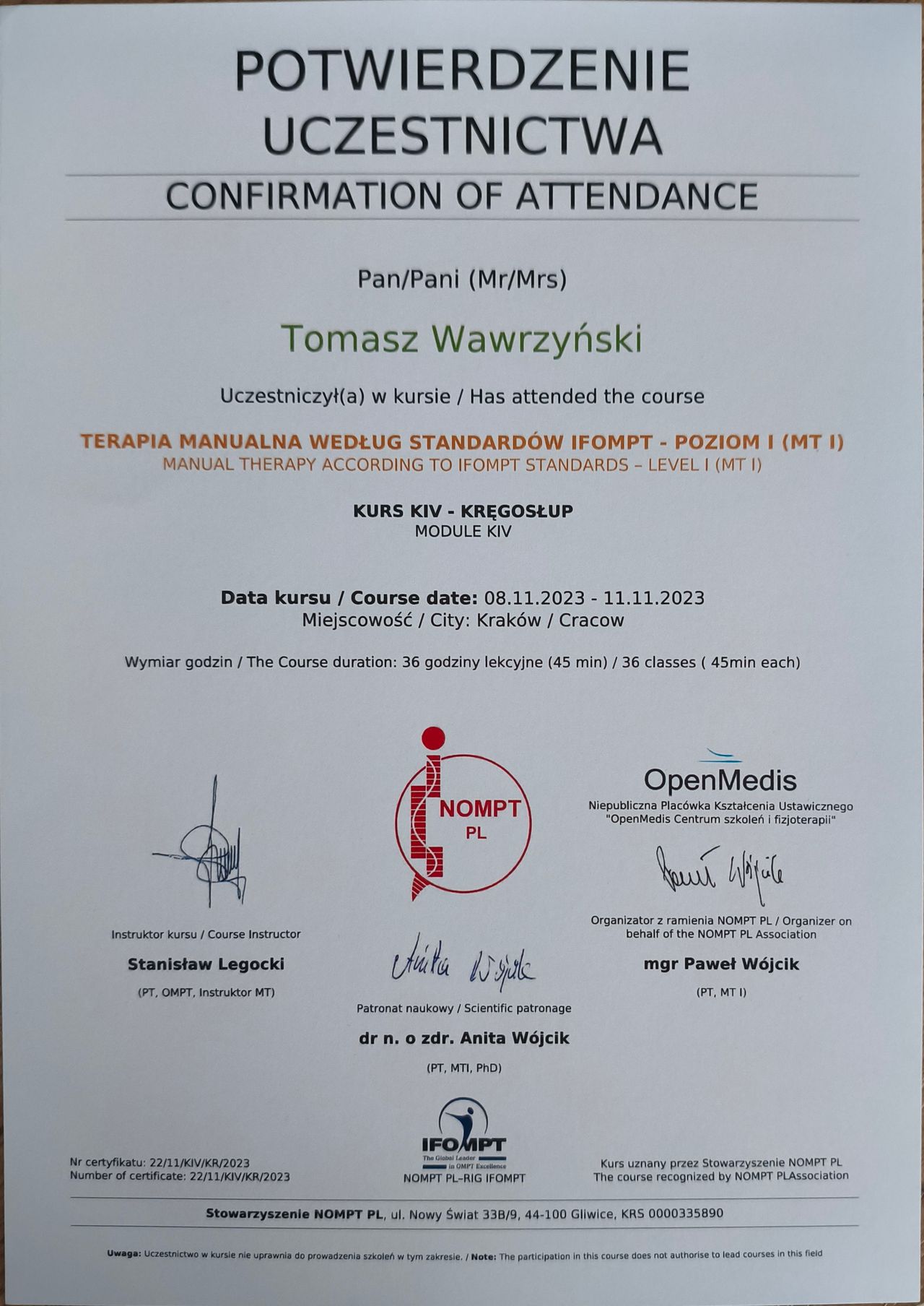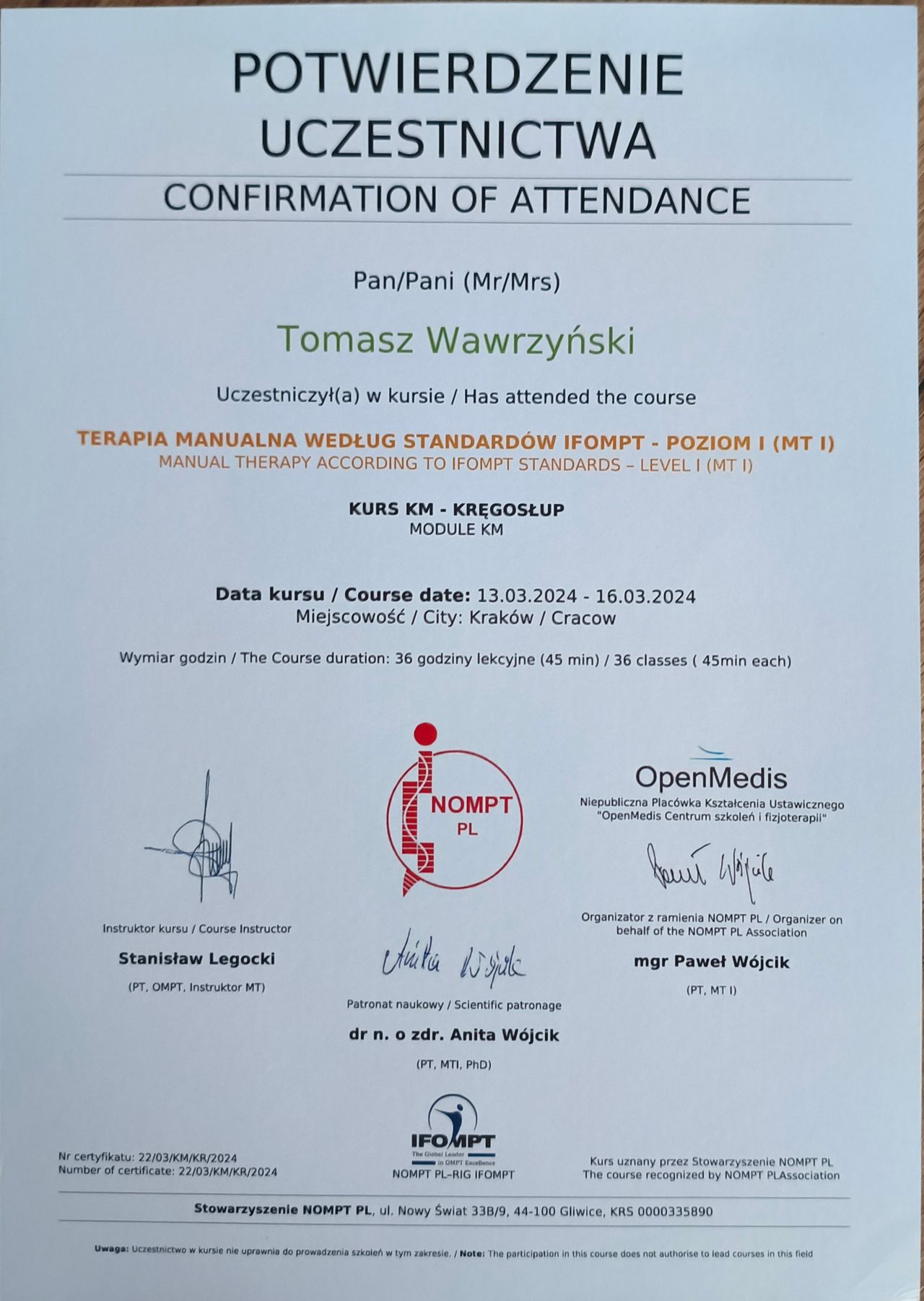 -Terapia Manualna wg. Standardów IFOMPT poziom MTI (Moduł EB - kończyny, Moduł EII - kończyny, Moduł KI - kręgosłup, Moduł KII - kręgosłup, Moduł EIII - kończyny, Moduł EM - kończyny (mięśnie), Moduł KIII - kręgosłup, Moduł KIV - kręgosłup, Moduł KM - kręgosłup (mięśnie) oraz Moduł X - egzaminacyjny zakończony tytułem MTI)