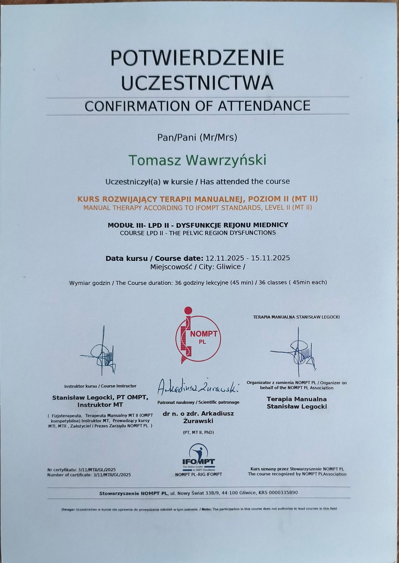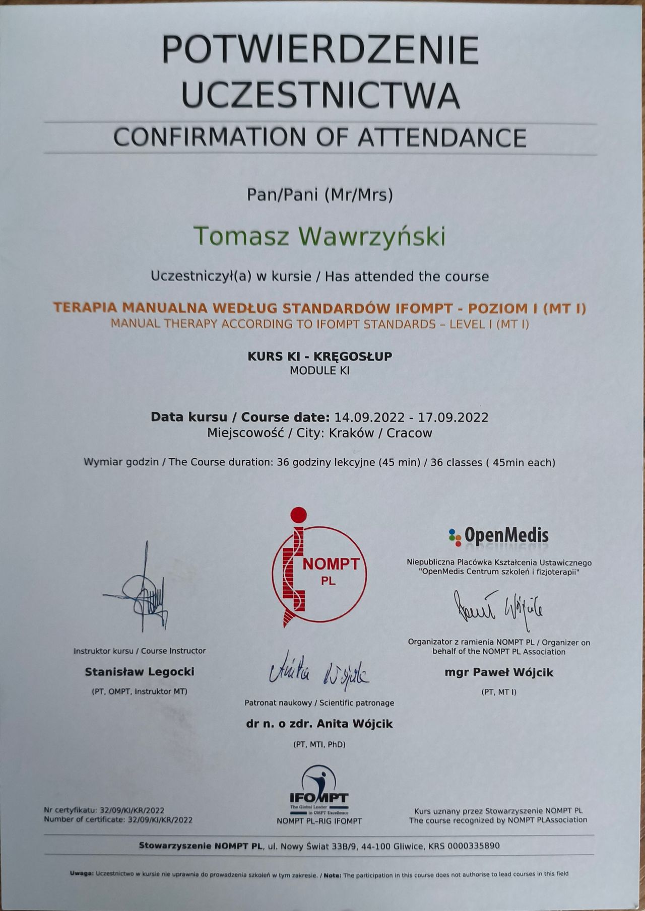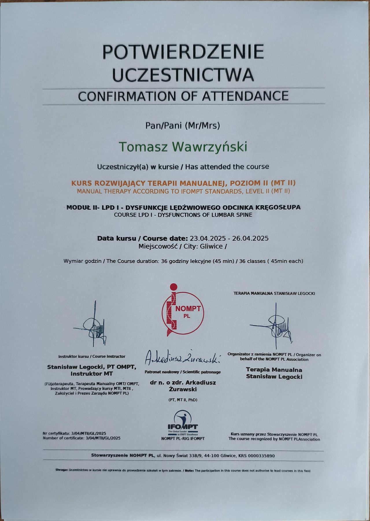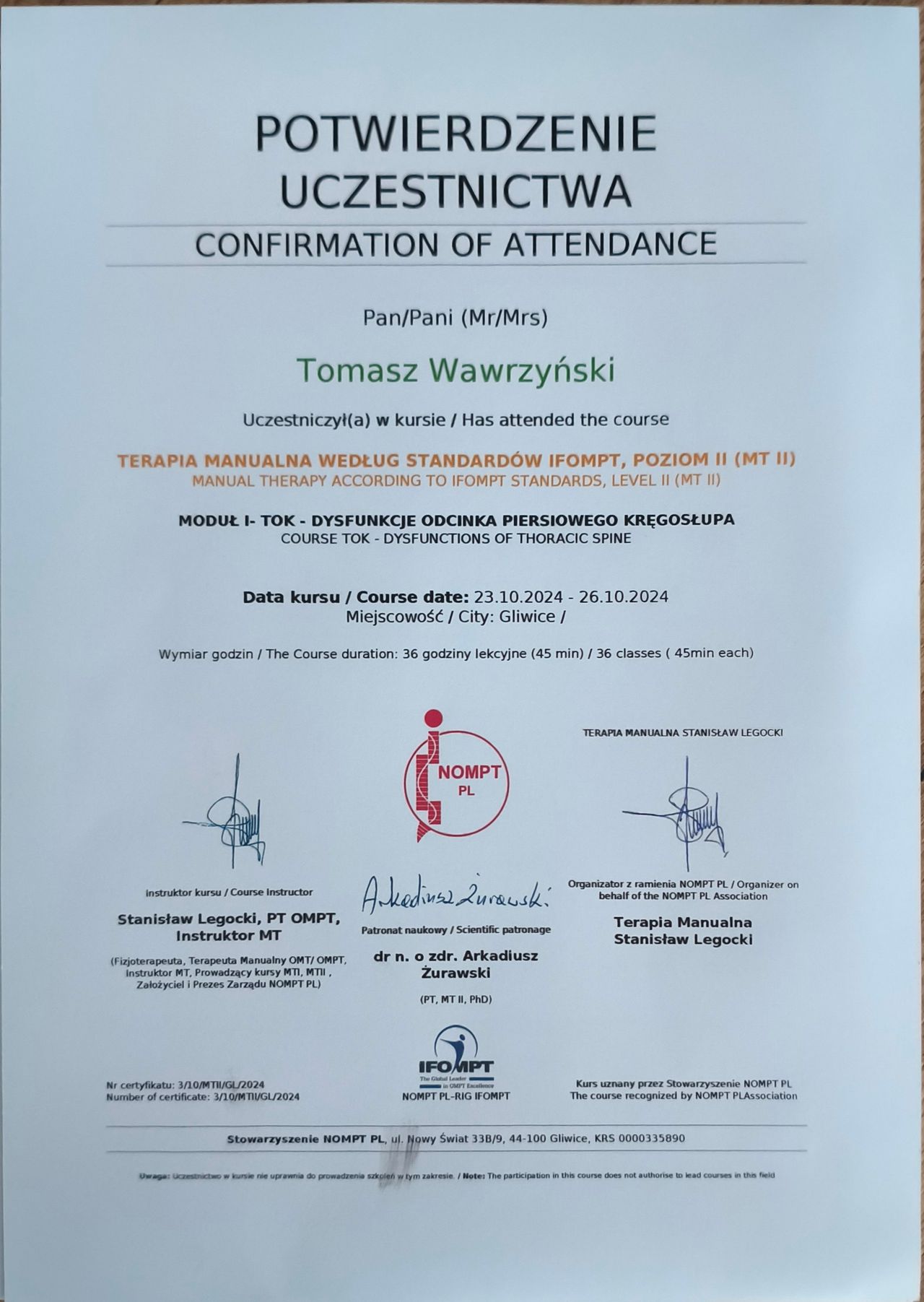 -Terapia Manualna wg. Standardów IFOMPT poziom MTII (Moduł I - TOK, dysfunkcje odcinka piersiowego kręgosłupa; moduł II - LPDI, dysfunkcje lędźwiowego odcinka kręgosłupa; moduł III - dysfunkcje rejonu miednicy)