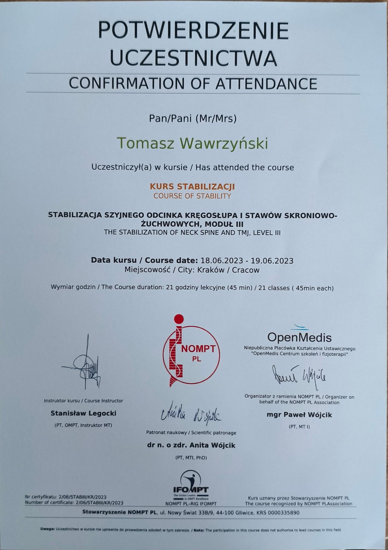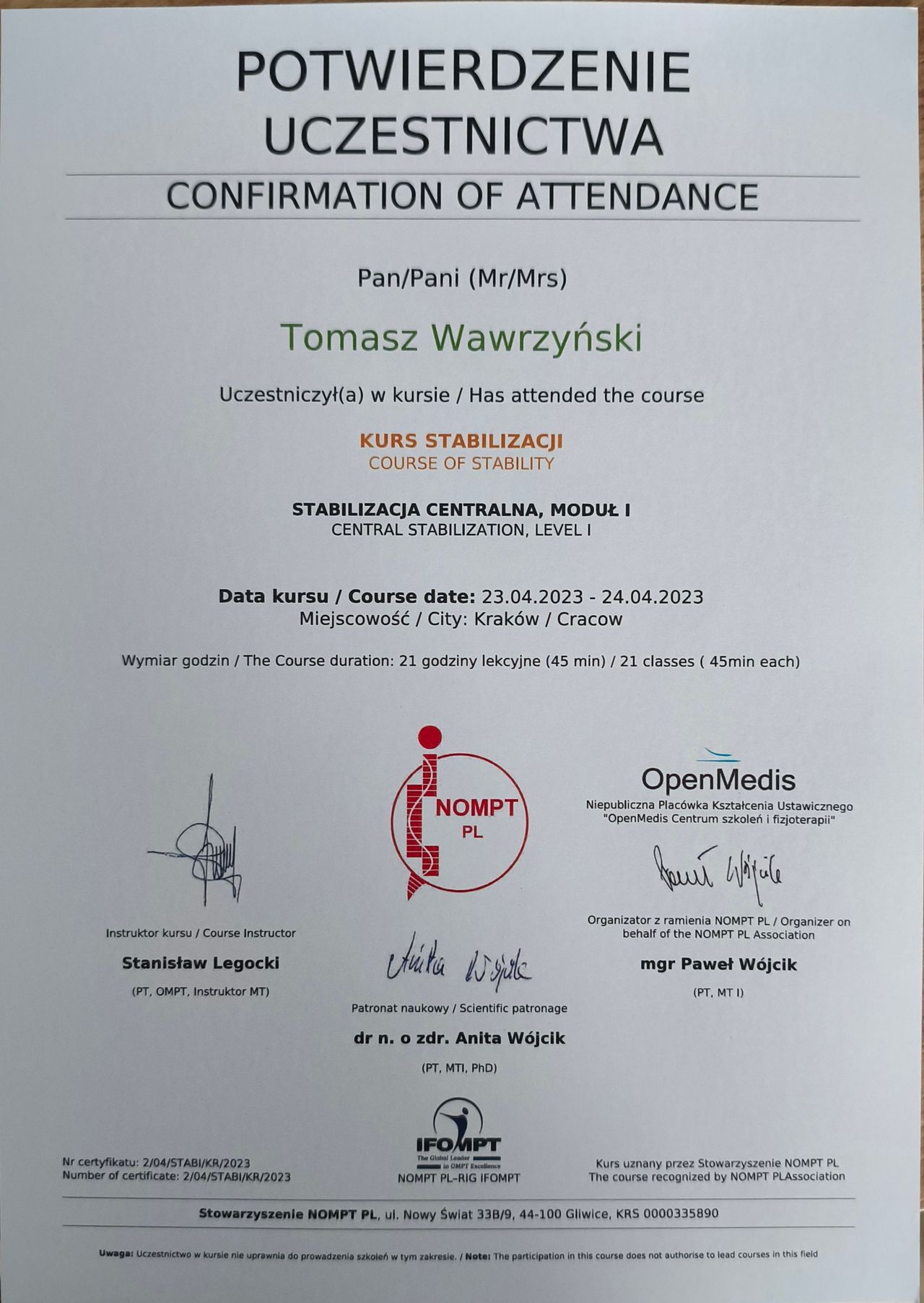 -Kurs Stabilizacji (Moduł I - Stabilizacja Centralna, Moduł II - Stabilizacja stawów obwodowych, Moduł III - Stabilizacja szyjnego odcinka kręgosłupa oraz stawów skroniowo-żuchwowych)
