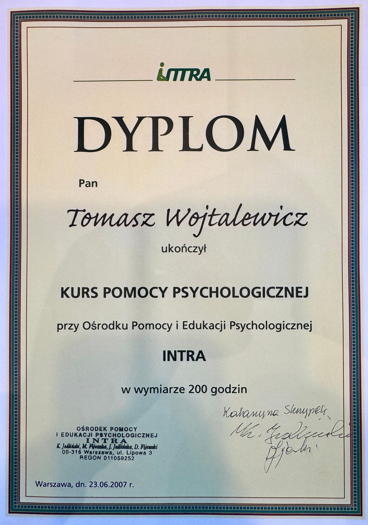 Uzyskał dyplom Szkoły Wyższej Psychologii Społecznej w Warszawie oraz specjalizował się w dziedzinie psychoterapii w Ośrodku Pomocy i Edukacji Psychologicznej „INTRA” w Warszawie, rekomendowanej przez Polskie Towarzystwo Psychologiczne. Pracuje pod stałą superwizją specjalistów Polskiego Towarzystwa Psychologicznego.