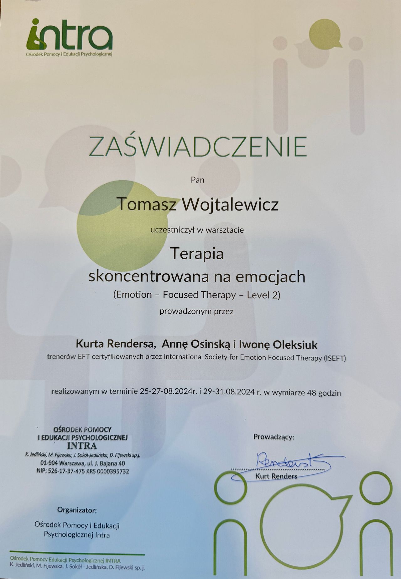 Gratuluję Ci odwagi, konsekwencji i refleksyjności, które wnosiłeś na nasze spotkania. Życzę Ci, by to, co wypracowaliśmy razem, wspierało Cię dalej — z siłą, spokojem i uważnością na siebie.