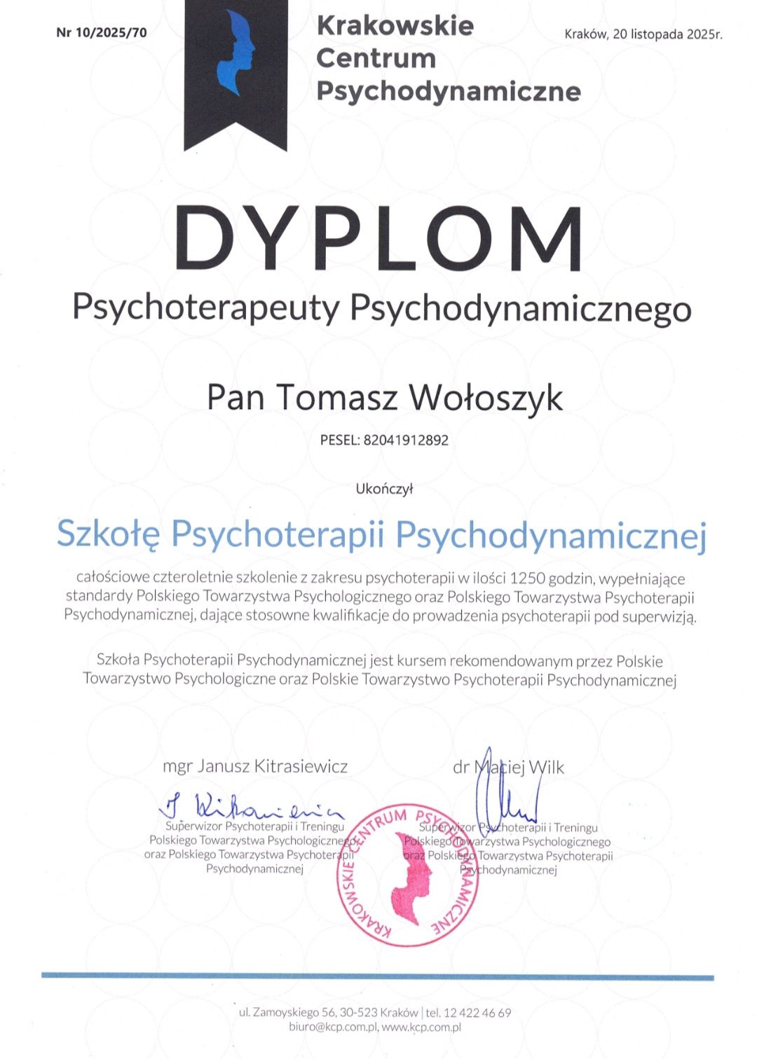 Jestem członkiem Polskiego Towarzystwa Psychoterapii Psychodynamicznej. Jestem psychoterapeutą po 4-letnim specjalistycznym studium podyplomowym z psychoterapii prowadzonym przez Krakowskie Centrum Psychodynamiczne. Studium rekomendowane jest przez Polskie Towarzystwo Psychologiczne. Program studium spełnia formalne wymogi certyfikacyjne szkolenia psychoterapeutycznego określone przez Polskie Towarzystwo Psychologiczne. Mam 17 letnie doświadczenie w prowadzeniu sesji psychoterapii indywidualnej osób dorosłych, młodzieży i dzieci, w tym 14 lat pracy w Centrum Zdrowia Psychicznego (na NFZ) w Gdyni ul. Traugutta 9. Prowadziłem również grupy socjoterapeutyczne między innymi dla Miejskiego Ośrodka Pomocy Społecznej (MOPS) w gdyńskiej świetlicy socjoterapeutycznej "Łajba". Zapraszam osoby potrzebujące wsparcia w nagłej trudnej sytuacji oraz te, które od dłuższego czasu nie radzą sobie z emocjami (niekontrolowane wybuchy złości, przewlekły smutek, brak sił, bezsilność, poczucie winy) lub zauważają u siebie objawy innych zaburzeń. Ukończyłem 5-letnie studia magisterskie na Uniwersytecie Gdańskim, specjalizując się w psychologii klinicznej osób dorosłych oraz 5-letnie studia magisterskie na Uniwersytecie Gdańskim na kierunku pedagogiki. Ukończyłem również dwuletnie Studium Socjoterapii i Treningu Interpersonalnego realizowane przez Krakowskie Centrum Psychodynamiczne, a także kurs Socjoterapii i Psychoprofilaktyki w Placówkach Oświatowych. Zapraszam do umówienia się na pierwsze spotkanie, podczas którego przeprowadzę uporządkowany wywiad i wspólnie podejmiemy decyzję czy zachodzi potrzeba otwarcia procesu psychoterapeutycznego. Pracuję w nurcie psychodynamicznym. Psychoterapia tego typu polega na budowaniu zdrowej relacji terapeutycznej między terapeutą a pacjentem w celu zapewnienia trwałej zmiany samopoczucia i funkcjonowania pacjenta. Jest to forma pracy długoterminowej. Pomagam pacjentowi zrozumieć zachodzące w nim procesy psychologiczne i uporządkować je. Psychoterapia ma za zadanie nauczyć samodzielnego radzenia sobie ze swoimi trudnościami.