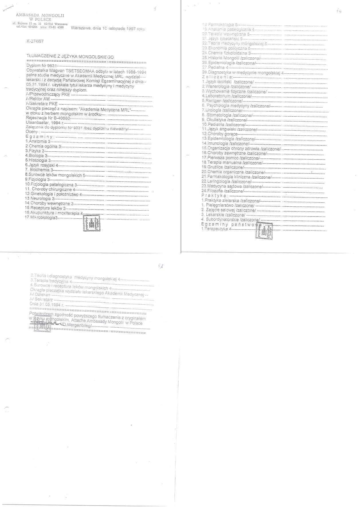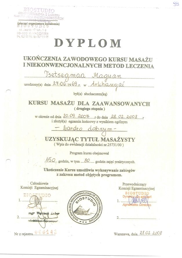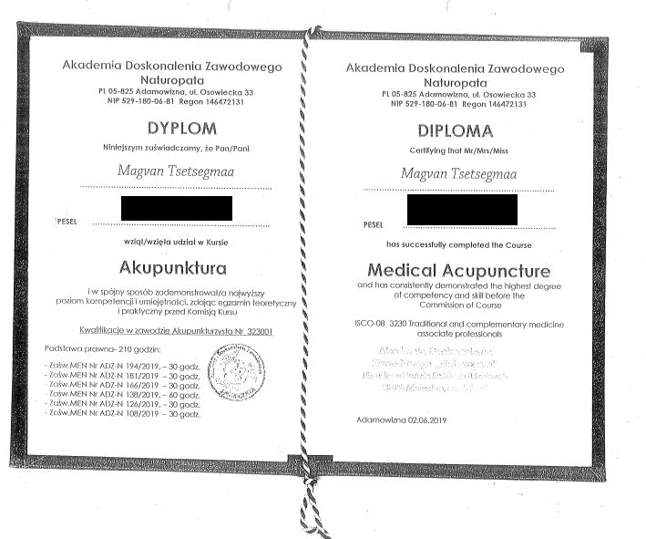 Absolwentka Uniwersytetu Medycznego w Ułan Bator (Mongolia), gdzie ukończyła studia w 1994 roku. Posiada wieloletnie doświadczenie w zakresie medycyny wschodniej, w tym akupunktury koreańskiej, japońskiej, chińskiej, mongolskiej, a także suchoigłowej i czaszkowej.