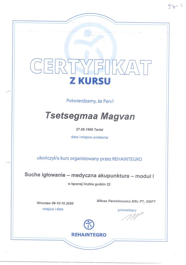 Jaki jest zakres porad oferowanych przez Tsetsegmaa Magvan?Tsetsegmaa Magvan to lekarz bez specjalizacji. Na podstawie swojego doświadczenia i wykształcenia Tsetsegmaa Magvan oferuje usługi takie jak: akupunktura.