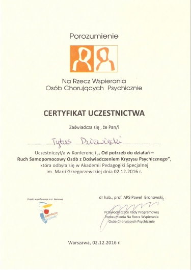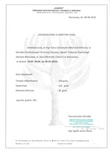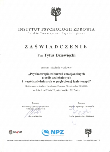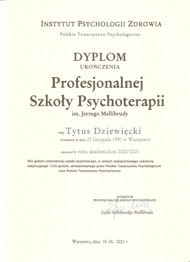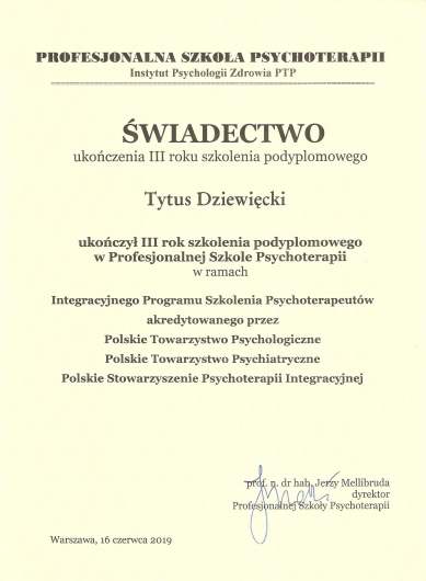 Zakończyłem cykl terapeutyczny (składający się na 25spotkan - ok. pół roku) u Pana Tytusa niecałe 2 miesiące temu. Jakość mojego życia znacząco się poprawiła. Przepracowalismy tematy związane ze wspieraniem siebie i stawania po swojej stronie, poczuciu własnej wartości, zdrowego wyrażania gniewu oraz komunikacji w związku. Sięgając do mojego dzieciństwa, udało się rozpracować źródło wielu moich schematów. Co prawda terapia uzależnień nie jest specjalnością Pana Tytusa, lecz zrealizowane spotkania psychoterapeutyczne znacząco pomogły mi uwolnić się od uzależnień. Stało się to dzięki nauce aby rozwiązań i wsparcia szukać wewnątrz a nie w zewnętrznych środkach czy działaniach. Uważam, że Pan Tytus jest wspaniałym psychoterapeutą, gorąco polecam każdemu w potrzebie.