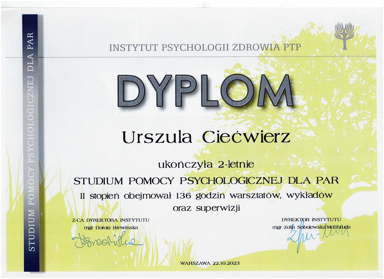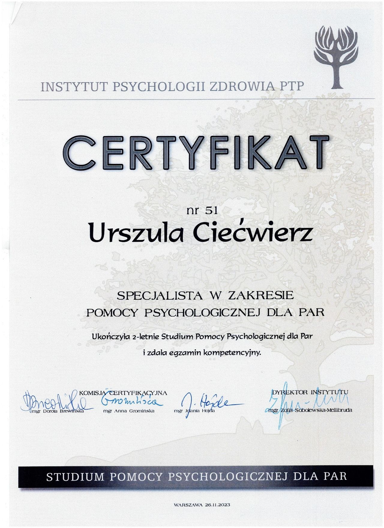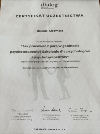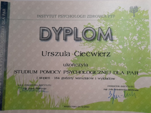Certyfikowaną Terapeutką Par (szkolenie odbyłam w Profesjonalnej Szkole Psychoterapii Instytutu Psychologii Zdrowia).