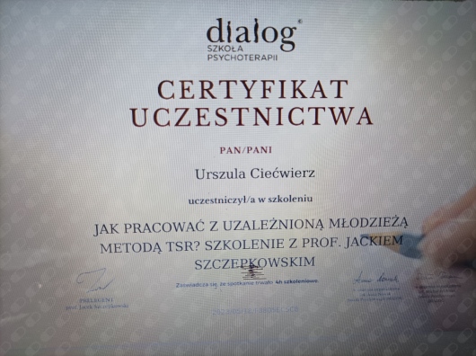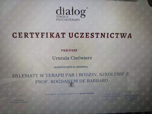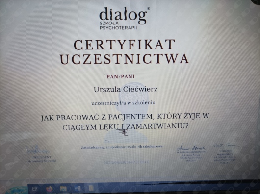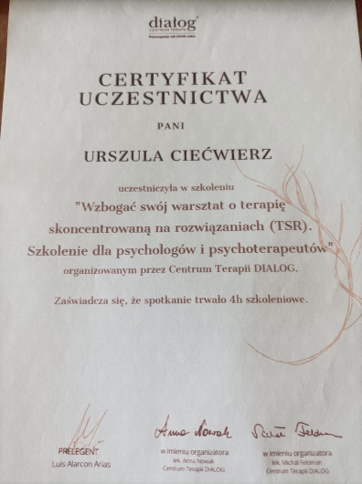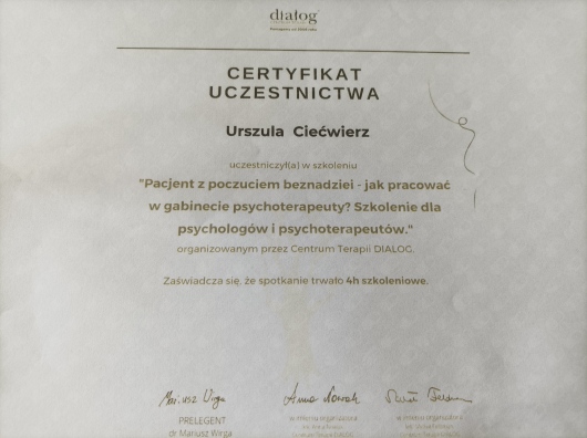 Swoją wiedzę nieustannie pogłębiam uczestnicząc systematycznie w licznych kursach i szkoleniach organizowanych min. przez Centrum Terapii Dialog. Posiadam liczne Certyfikaty z odbytych szkoleń. min. ,,Terapii Skoncentrowanej na rozwiązaniach" czy ,,Praca z pacjentem w poczuciu beznadziei ", ,,Dylematy w terapii par i rodzin'' , ,,Praca z pacjentem żyjącym w ciągłym lęku i zamartwianiu'' ,, Okołoporodowa strata dziecka''