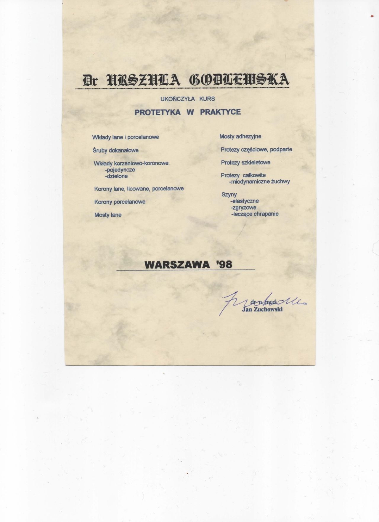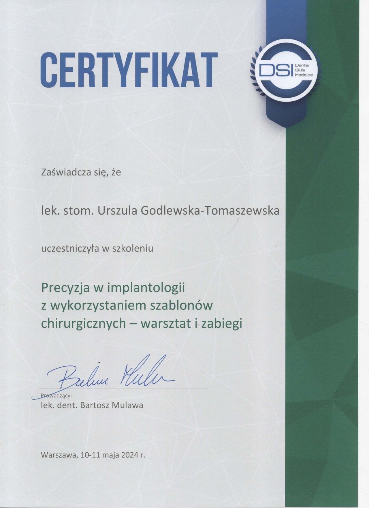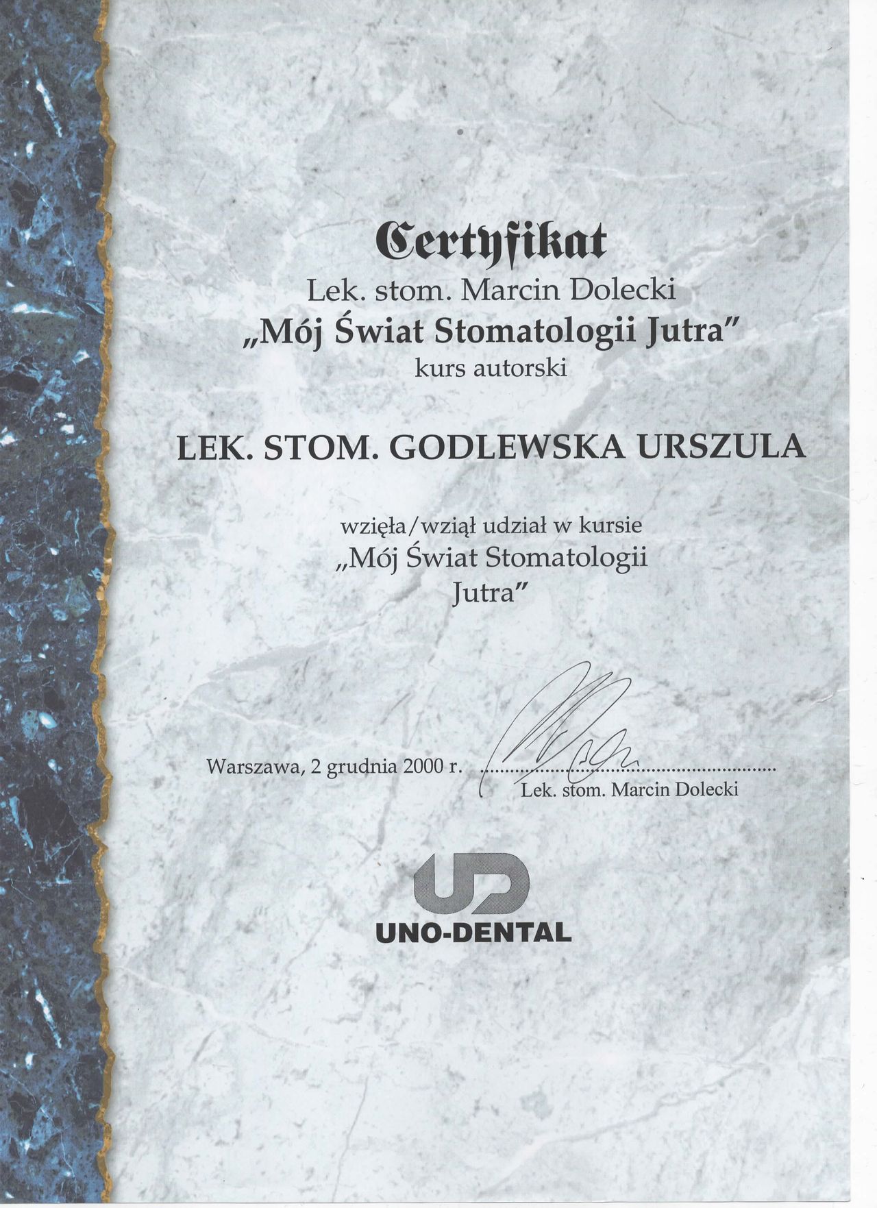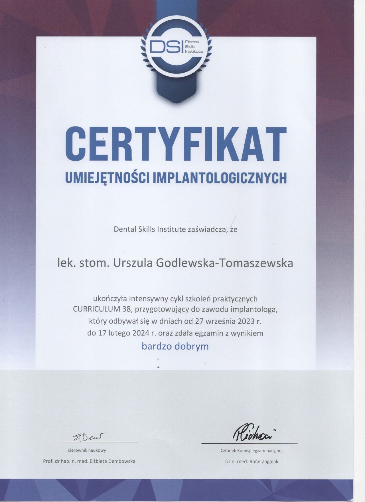 specjalista I stopnia stomatologii ogólnej z wieloletnim stażem. Zakres pracy klinice "Prestige Dental" stomatologia zachowawcza- nowoczesne lczenie zachowawcze w tym wypełnienie estetyczne zęba , bonding , lecznenie kanałowe w mikroskopie - pierwotne ,lecznenie kanałowe w mikroskopie- powtórne , protetyka - korony i mosty , protezy ruchome , implantologia- implantacja natychmiastowa oraz odroczona , augmentacja kości wyrostka , podniesienie zatoki szczękowej , zaburzenia stawu skroniowo - żuchwowego .Posiada bardzo bogate i wieloletnie doświadczenie zdobyte podczas pracy w renomowanych klinikach stomatologicznych w Białymstoku i Warszawie. Uczestnik wielu kursów specjalistycznych w Polsce oraz Niemczech, gdzie na bieżąco podnosi swoje kwalifikacje zawodowe. Biegle włada językiem angielskim i rosyjskim. , komunikatywny niemiecki O klinice Prestige Dental -nowoczesna klinika otwarta na warszawskim Żoliborzu w 2013 roku Naszym głównym celem jest oferowanie Państwu najwyższej jakości, kompleksowych usług stomatologicznych przy zachowaniu wysokich rygorów higieny i sterylności. Wieloletnie doświadczenie zaowocowało powstaniem wyjątkowej kliniki, w której duży nacisk kładziemy na profesjonalizm usług. Kadrę kliniki stanowią wysokiej klasy specjaliści, zarówno lekarze, jak i asysta stomatologiczna. Kładziemy nacisk na najwyższe standardy pracy, nowoczesne wyposażenie oraz cykliczne szkolenia całego personelu. Najwyższej jakości niemiecki sprzęt stomatologiczny oraz diagnostyczny pozwala na prowadzenie profesjonalnego leczenia w jednym miejscu. Dysponujemy m.in urządzeniem do wykonywania pantomogramów cyfrowych oraz mikroskopem. Naszym celem, jest pełna satysfakcja i dobro wszystkich naszych Pacjentów. Jesteście Państwo mile widziani. Zapraszamy do skorzystania z usług.