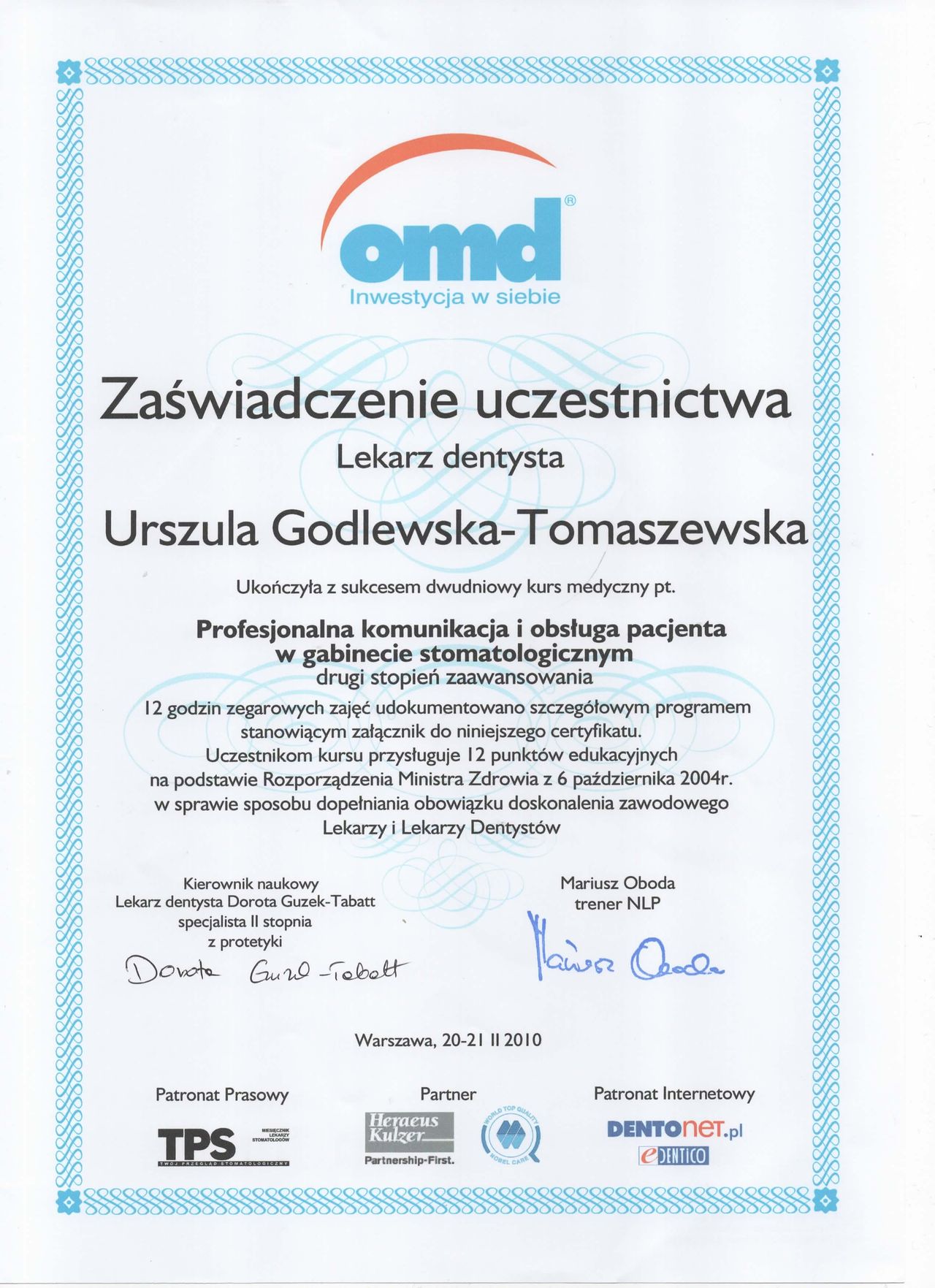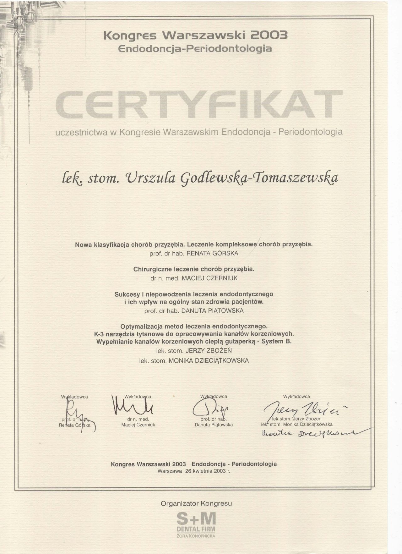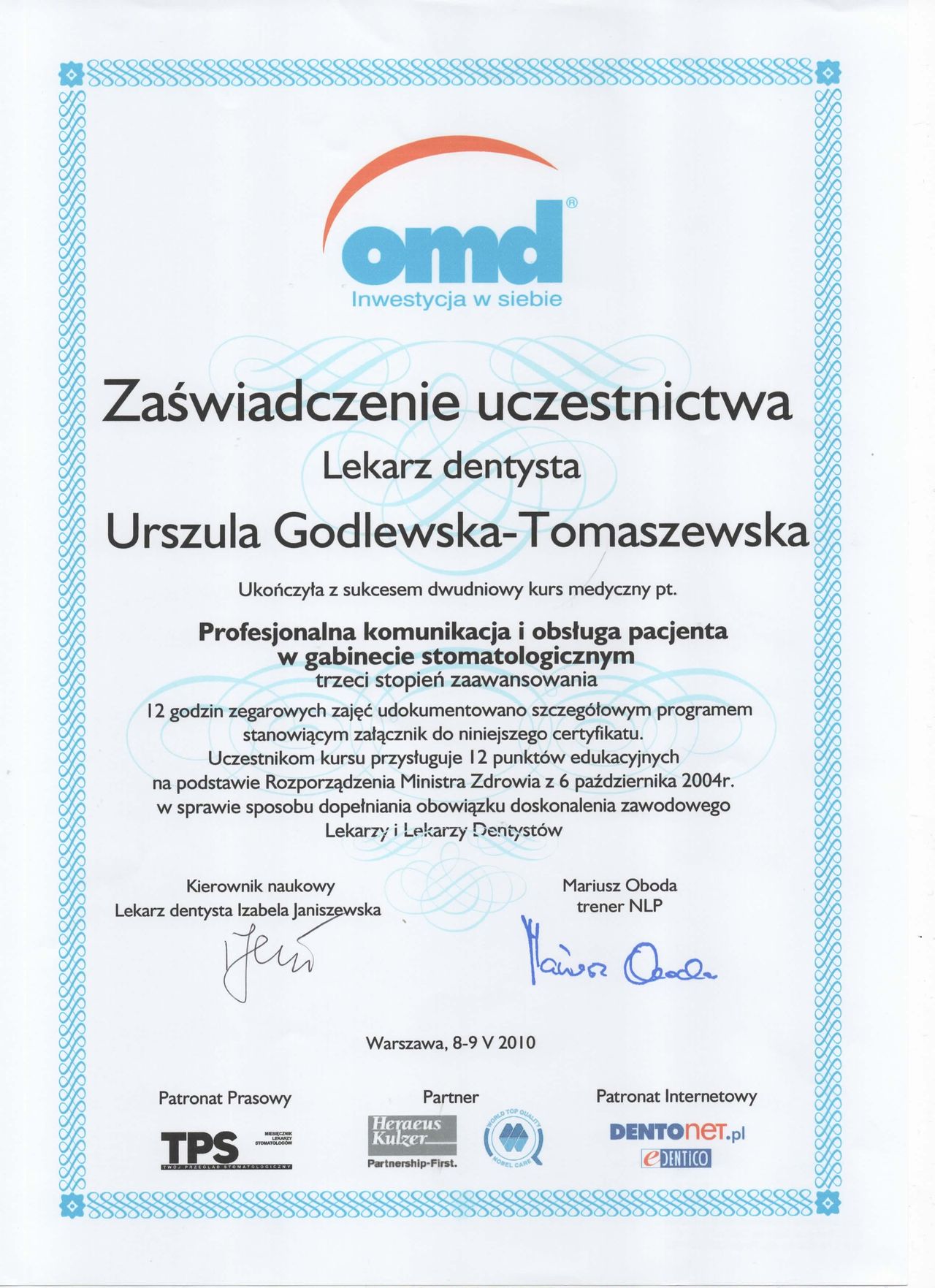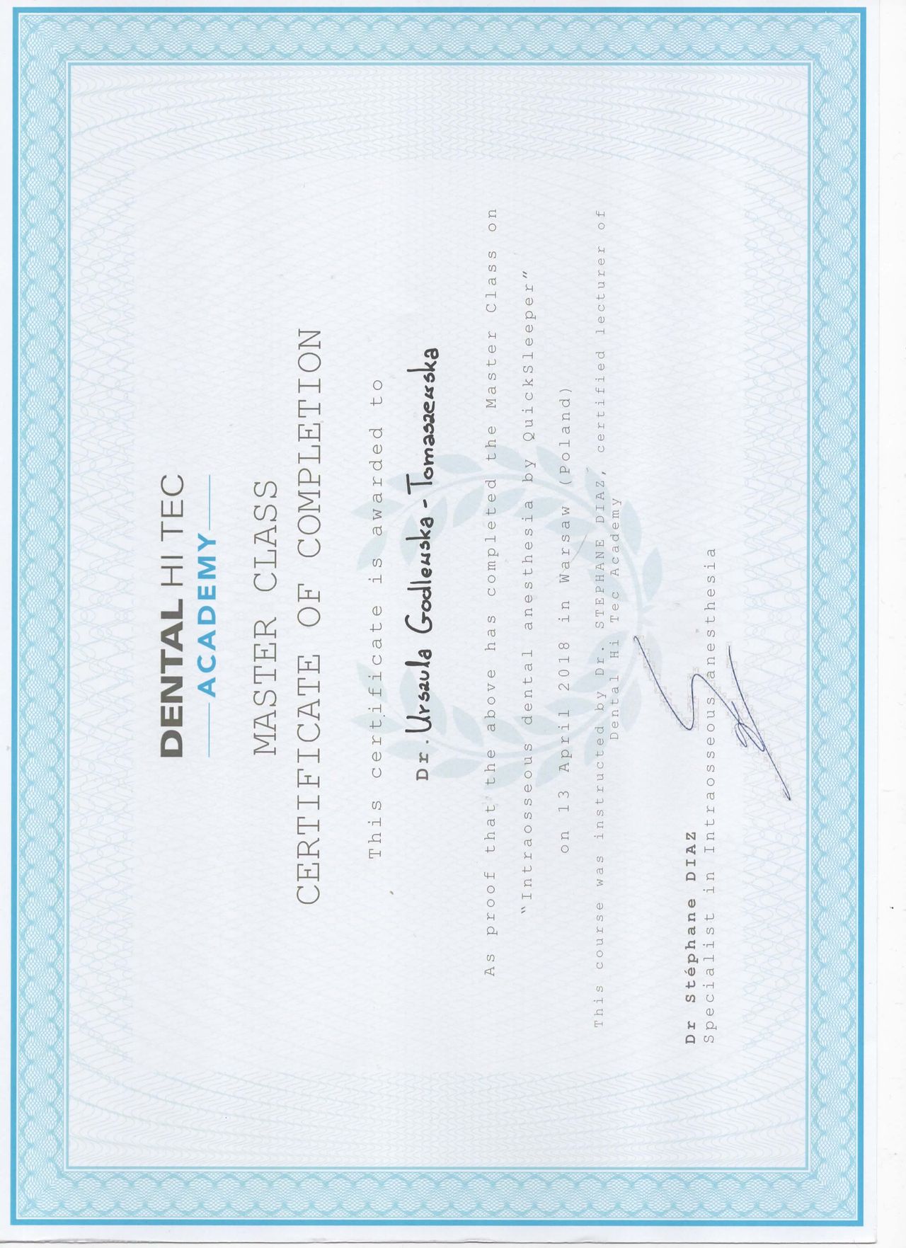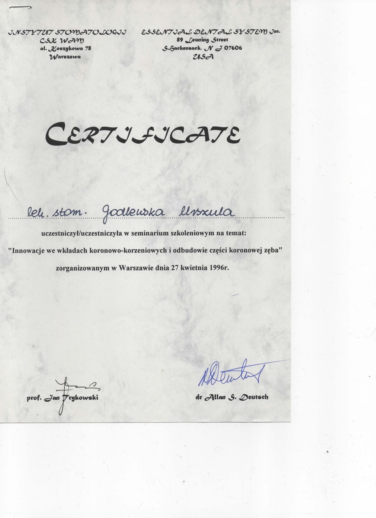 specjalista I stopnia stomatologii ogólnej z wieloletnim stażem. Zakres pracy klinice "Prestige Dental" stomatologia zachowawcza- nowoczesne lczenie zachowawcze w tym wypełnienie estetyczne zęba , bonding , lecznenie kanałowe w mikroskopie - pierwotne ,lecznenie kanałowe w mikroskopie- powtórne , protetyka - korony i mosty , protezy ruchome , implantologia- implantacja natychmiastowa oraz odroczona , augmentacja kości wyrostka , podniesienie zatoki szczękowej , zaburzenia stawu skroniowo - żuchwowego .Posiada bardzo bogate i wieloletnie doświadczenie zdobyte podczas pracy w renomowanych klinikach stomatologicznych w Białymstoku i Warszawie. Uczestnik wielu kursów specjalistycznych w Polsce oraz Niemczech, gdzie na bieżąco podnosi swoje kwalifikacje zawodowe. Biegle włada językiem angielskim i rosyjskim. , komunikatywny niemiecki O klinice Prestige Dental -nowoczesna klinika otwarta na warszawskim Żoliborzu w 2013 roku Naszym głównym celem jest oferowanie Państwu najwyższej jakości, kompleksowych usług stomatologicznych przy zachowaniu wysokich rygorów higieny i sterylności. Wieloletnie doświadczenie zaowocowało powstaniem wyjątkowej kliniki, w której duży nacisk kładziemy na profesjonalizm usług. Kadrę kliniki stanowią wysokiej klasy specjaliści, zarówno lekarze, jak i asysta stomatologiczna. Kładziemy nacisk na najwyższe standardy pracy, nowoczesne wyposażenie oraz cykliczne szkolenia całego personelu. Najwyższej jakości niemiecki sprzęt stomatologiczny oraz diagnostyczny pozwala na prowadzenie profesjonalnego leczenia w jednym miejscu. Dysponujemy m.in urządzeniem do wykonywania pantomogramów cyfrowych oraz mikroskopem. Naszym celem, jest pełna satysfakcja i dobro wszystkich naszych Pacjentów. Jesteście Państwo mile widziani. Zapraszamy do skorzystania z usług.