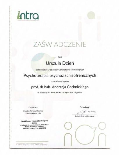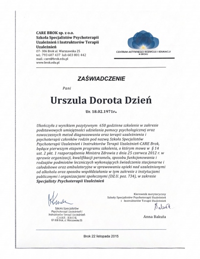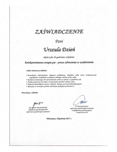 Bardzo kompetentna i zaangażowana terapeutka. Po rozmowie z panią Urszulą miałam poczucie, że trafiłam do właściwej osoby.