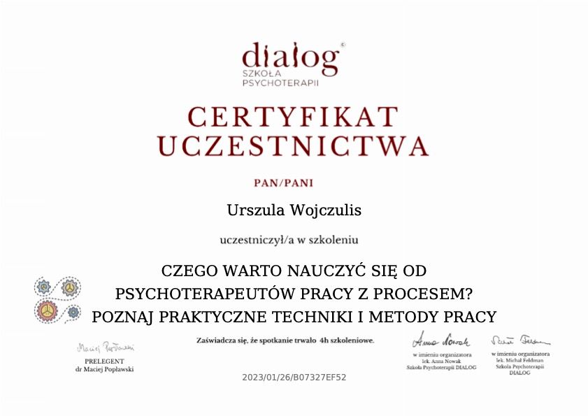 Spotkania z Panią Ulą były ogromnym wsparciem. Profesjonalizm, spokój i autentyczna empatia sprawiły, że łatwiej było otworzyć się i pracować nad sobą. Jestem bardzo wdzięczna i polecam każdemu, kto szuka realnej pomocy dla siebie bądź swego dziecka.