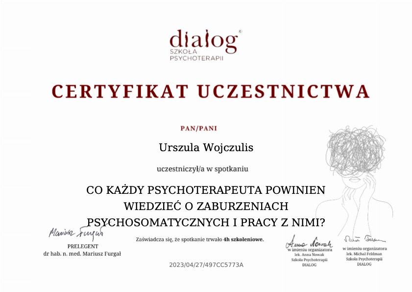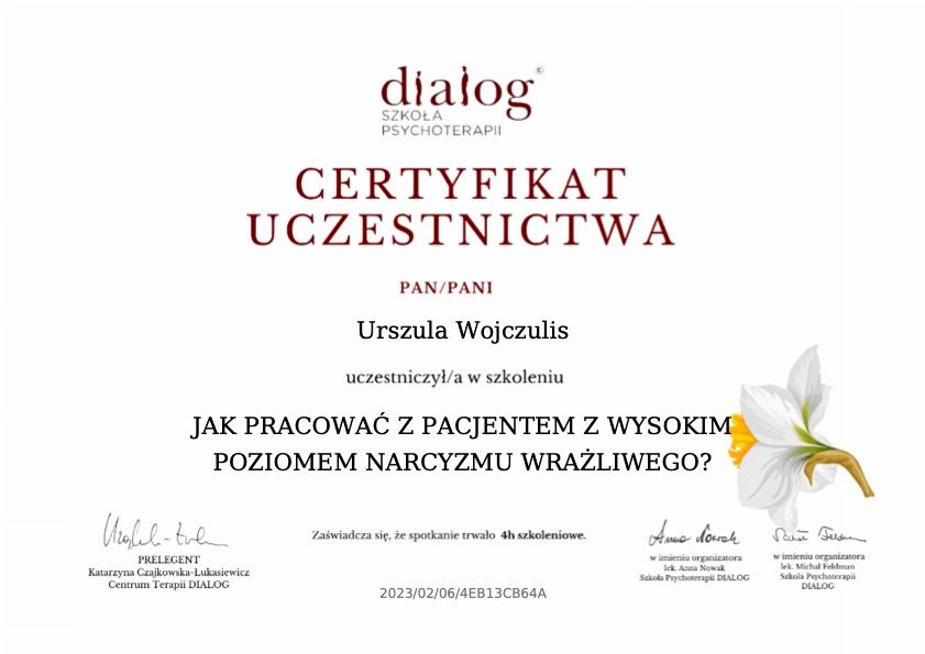 Pani Urszula zawsze profesjonalnie podchodzi do człowieka i w pełni angażuje się w proces leczenia. To niezwykle inteligentna i empatyczna terapeutka.