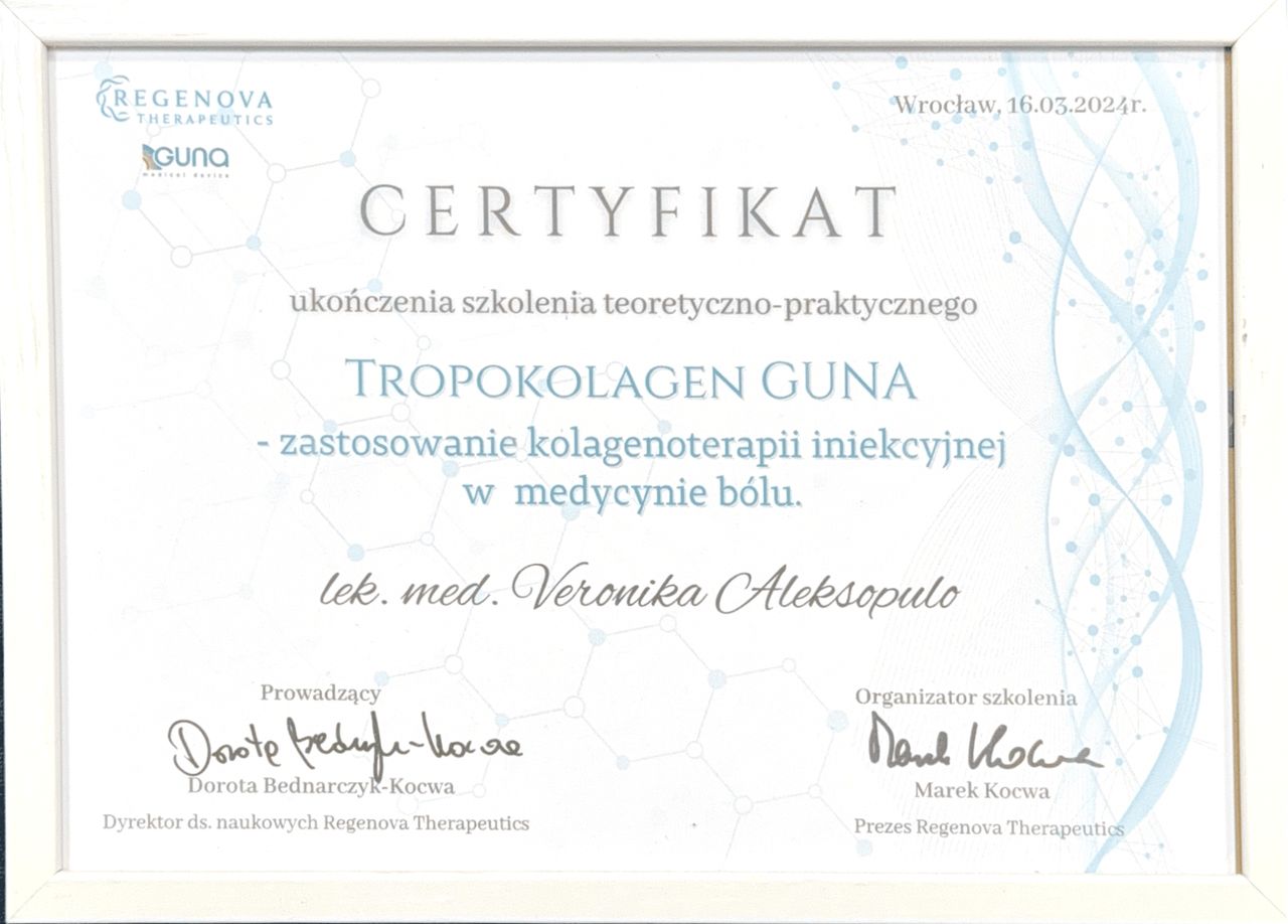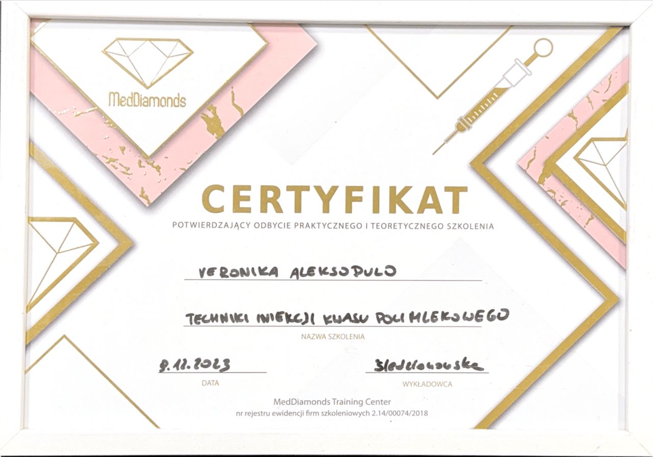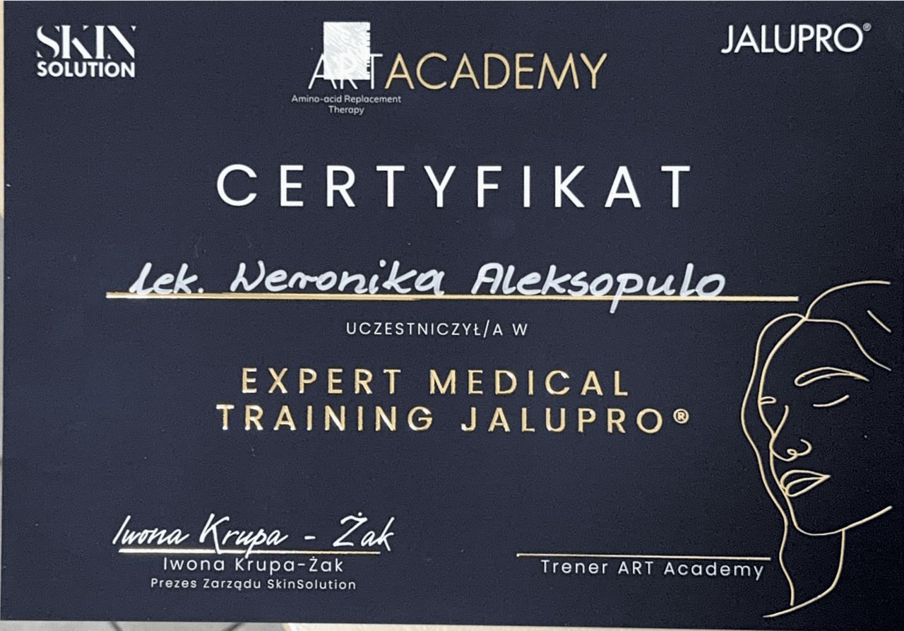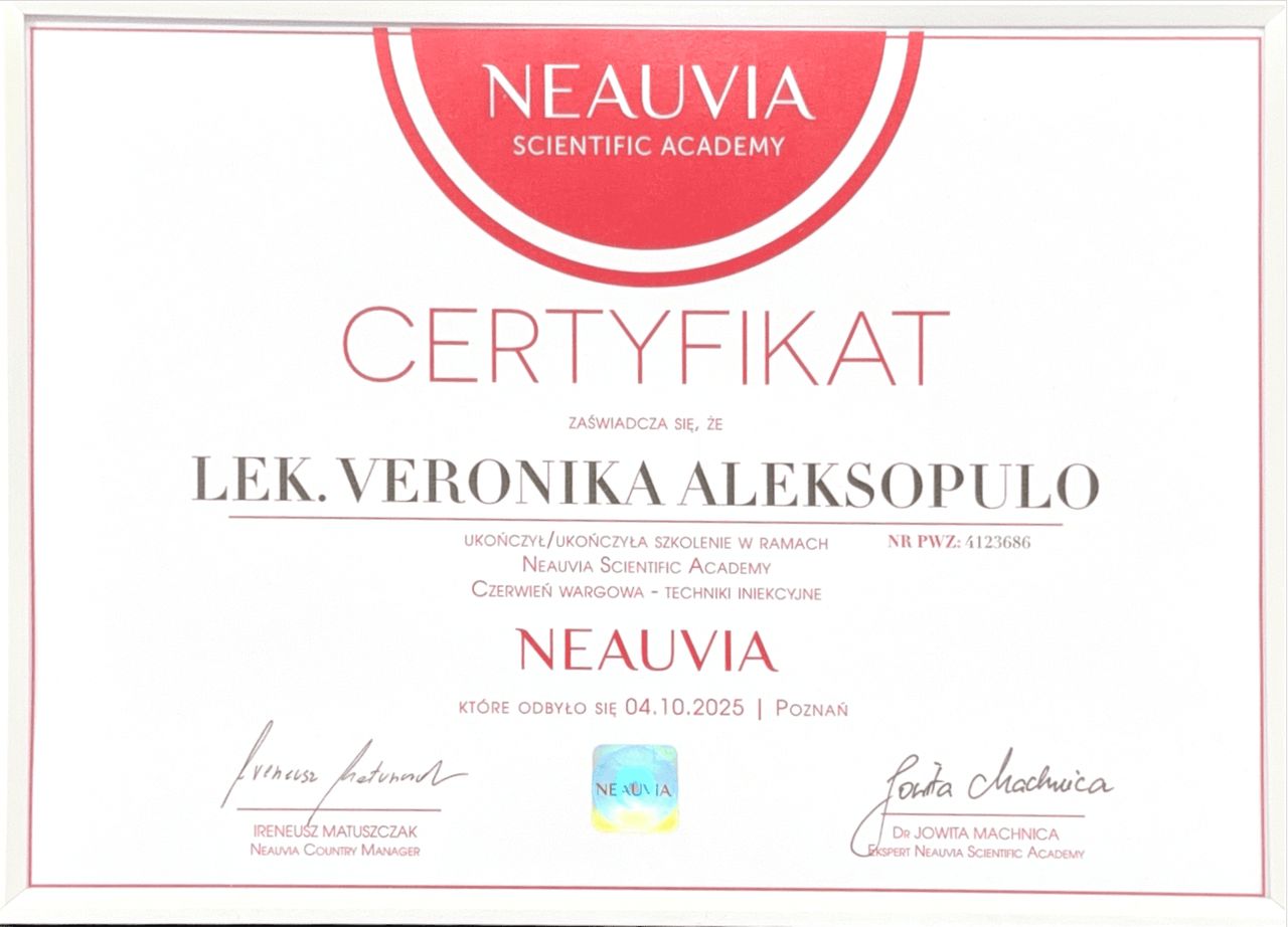 Jaki jest zakres porad oferowanych przez Veronika Aleksopulo?Veronika Aleksopulo to lekarz wykonujący zabiegi medycyny estetycznej. Na podstawie swojego doświadczenia i wykształcenia Veronika Aleksopulo oferuje usługi takie jak: Botoks, Konsultacja z zakresu medycyny estetycznej, kuracja oczyszczająca, Kwas hialuronowy, mezoterapia, Osocze bogatopłytkowe, Powiększanie ust, kolagen Linerase, lipoliza iniekcyjna, konsultacja trychologiczna.