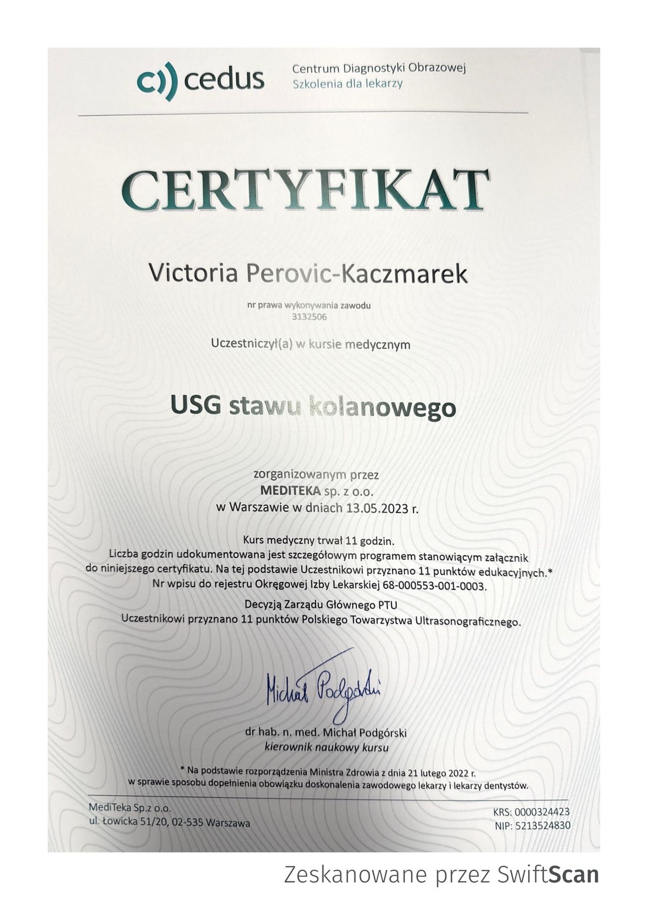 Stale podnosze swoje kwalifkkacje, uczestnicząc w licznych kursach i szkoleniach z zakresu ultrasonografii nadządu ruchu, nowoczesnych metod terapeutycznych i leczenia bólu.