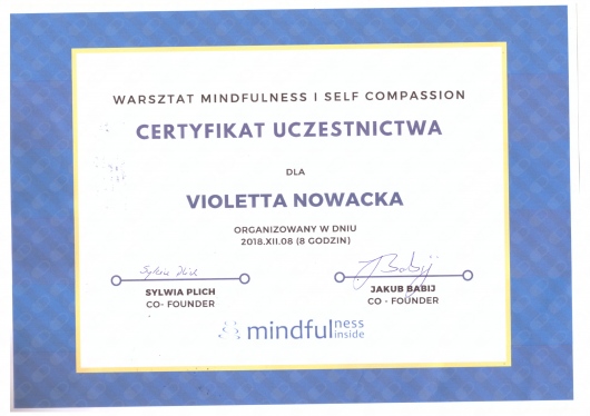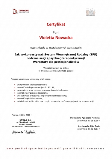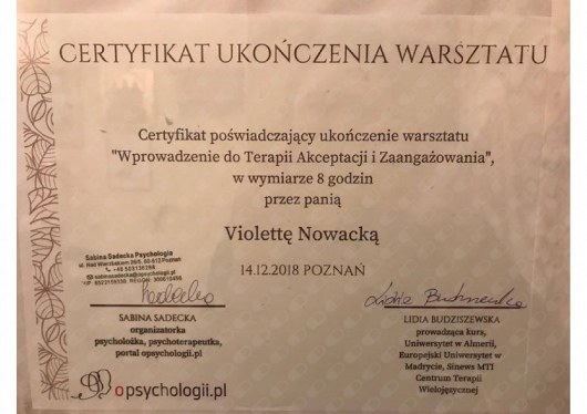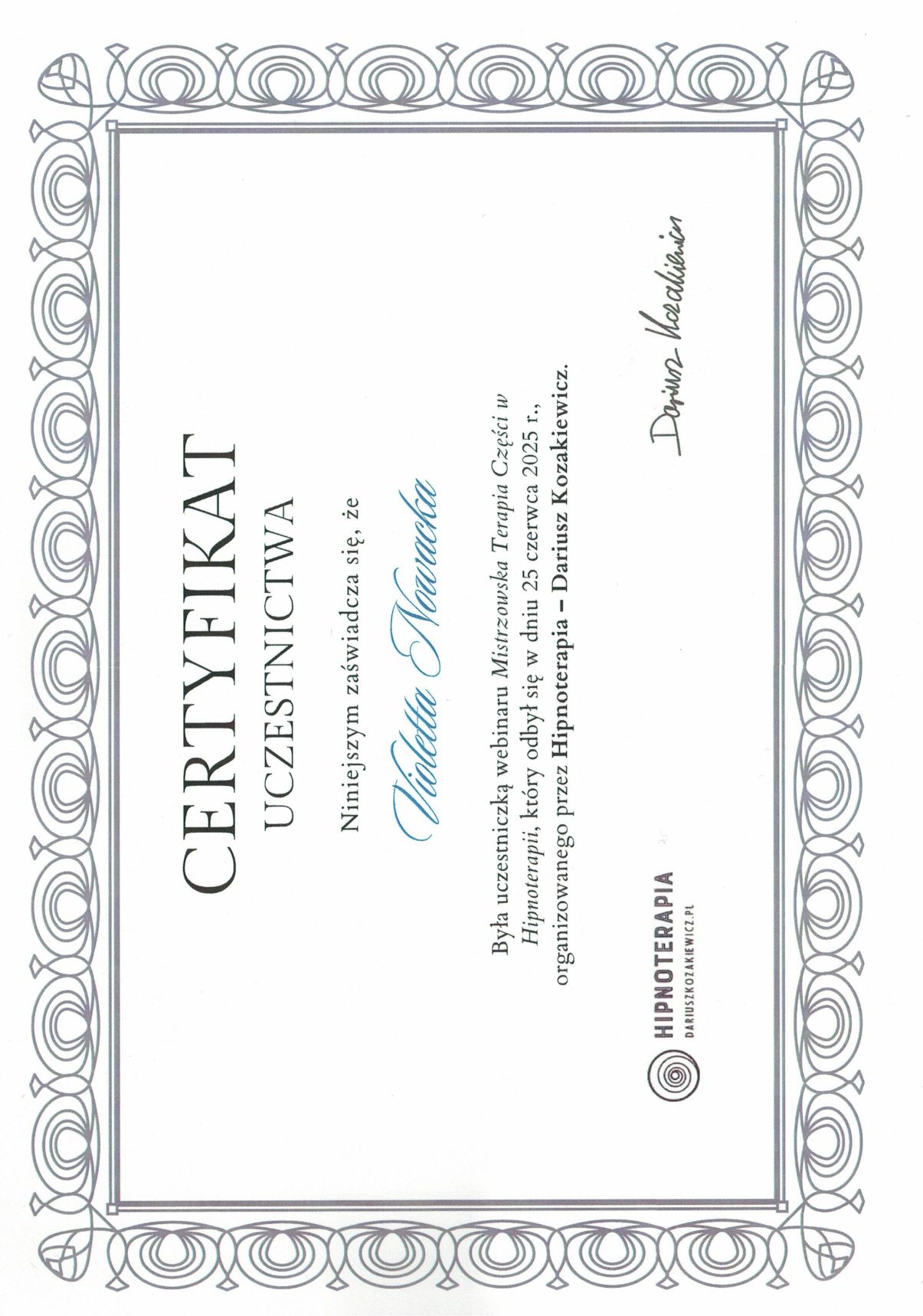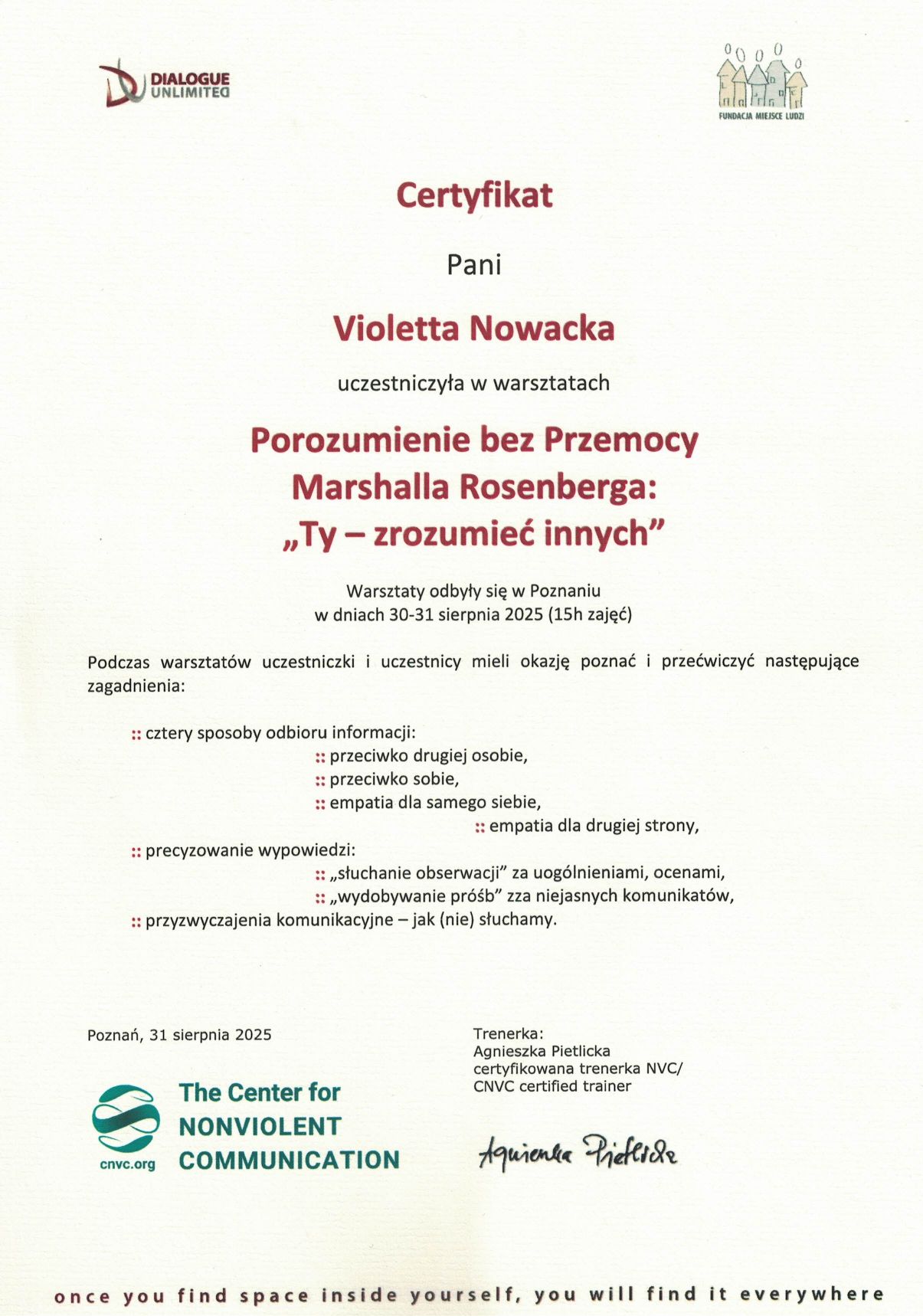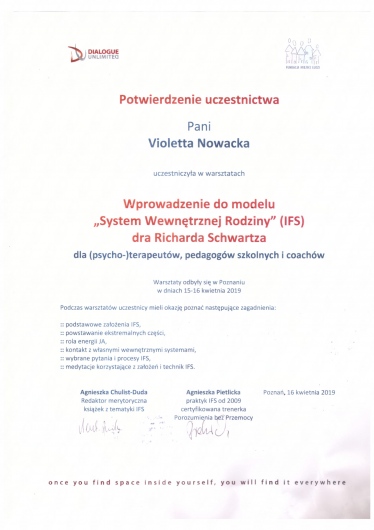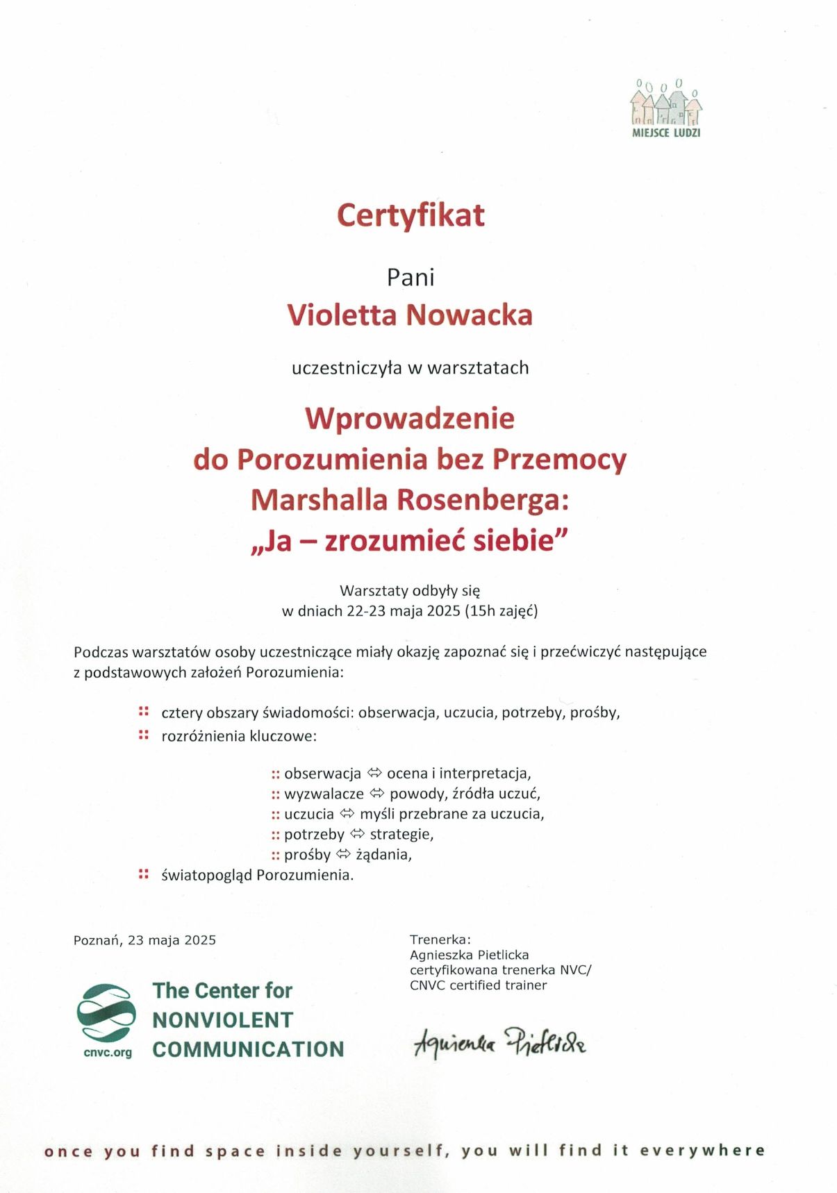 Profesjonalizm i skuteczność, a także zaangażowanie w proces i mnóstwo empatii. Polecam każdemu, kto chce pracować nad sobą i poprawić dzięki temu jakość swojego życia. Pani Violetta jest świetnym przewodnikiem, wsparciem i towarzyszem w tej podróży do samego siebie.