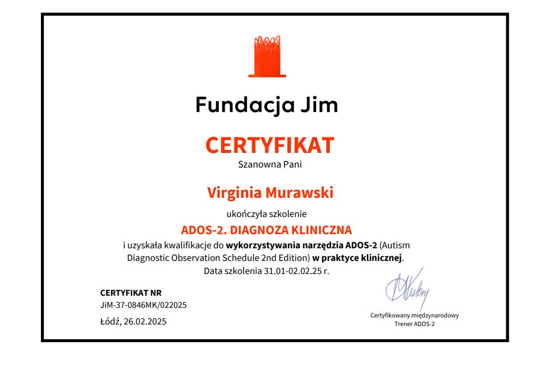 Najważniejszym szkoleniem pozostaje jednak diagnoza zaburzeń ze spektrum autyzmu w oparciu o badanie ADOS-2. Diagnozuję dzieci od 2 r.ż, młodzież oraz osoby dorosłe.