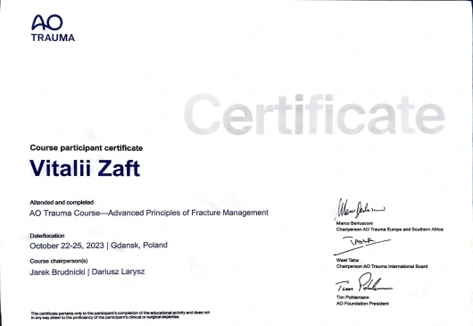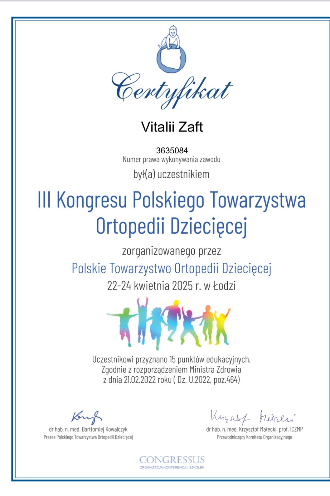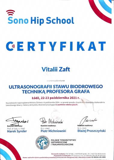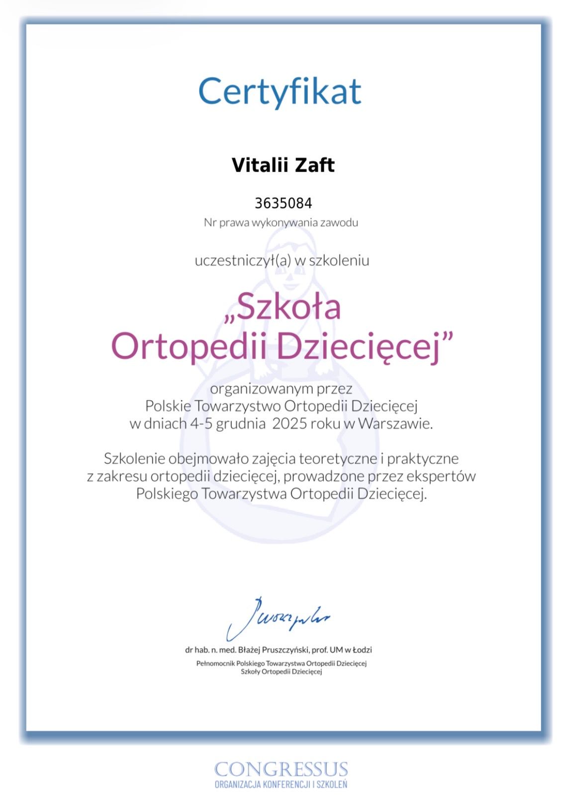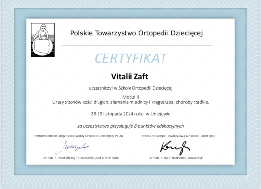 Jestem członkiem Polskiego Towarzystwa Ortopedycznego i Traumatologicznego (PTOiTr) oraz członkiem Polskiego Towarzystwa Ortopedii Dziecięcej
