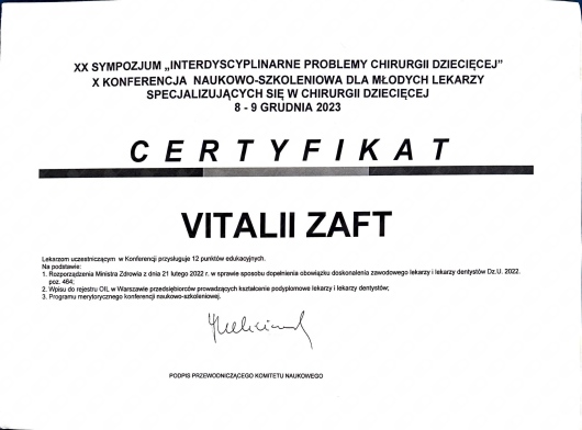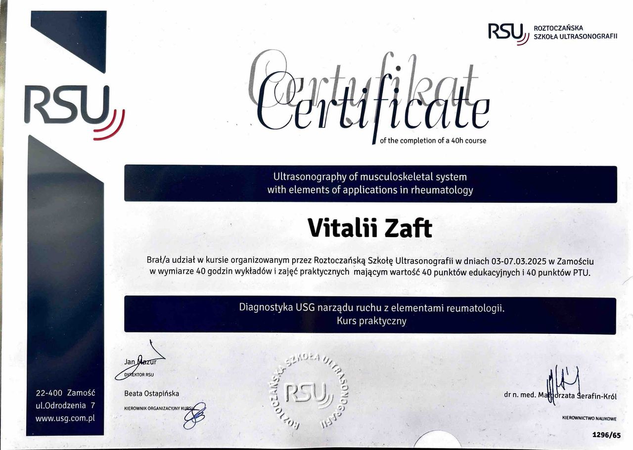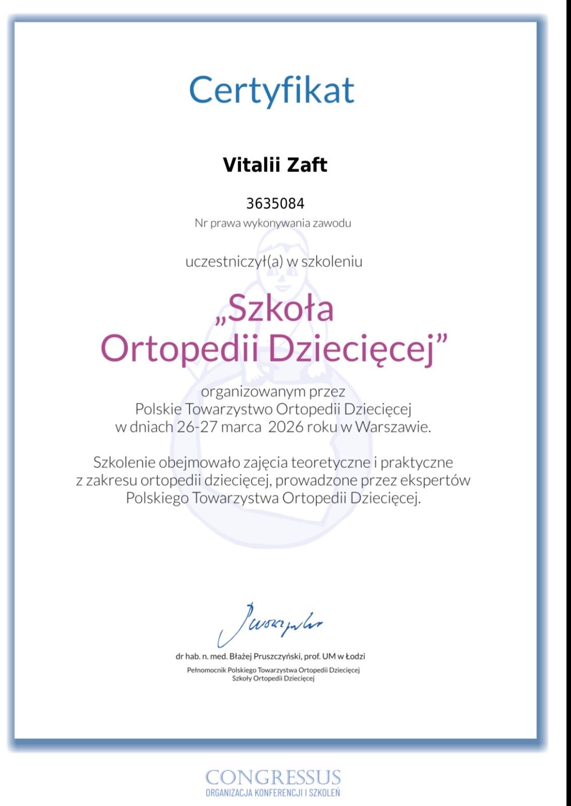 Jaki jest zakres porad oferowanych przez Vitalii Zaft?Vitalii Zaft to ortopeda dziecięcy. Na podstawie swojego doświadczenia i wykształcenia Vitalii Zaft oferuje usługi takie jak: badania przedoperacyjne, badania diagnostyczne, badania kręgosłupa, terapia przeciwbólowa, Kwas hialuronowy, badania profilaktyczne, konsultacja ortopedyczna, USG narządu ruchu, farmakoterapia, badanie układu ruchu.