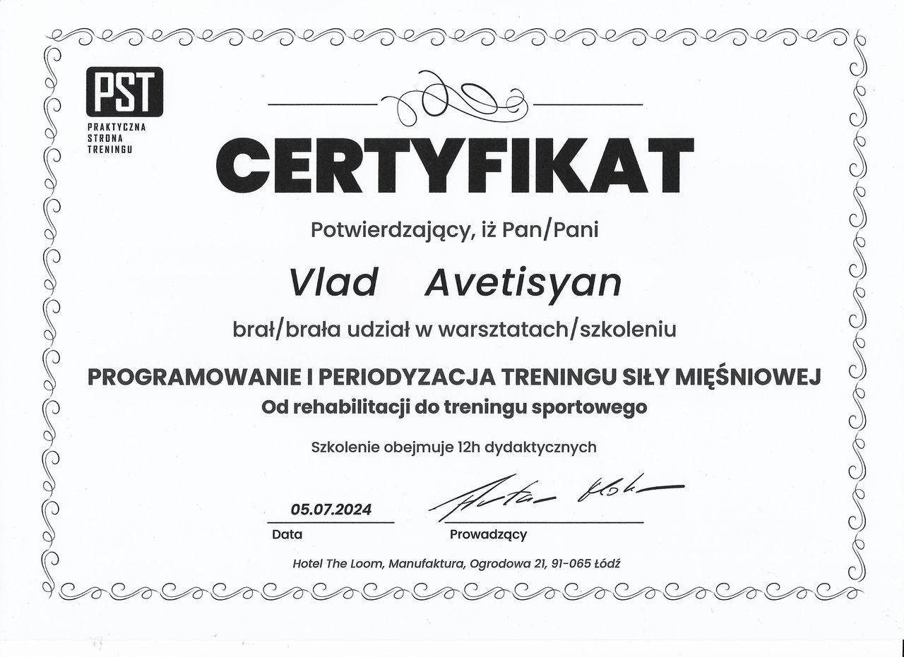 Jaki jest zakres porad oferowanych przez Vlad Avetisyan?Vlad Avetisyan to fizjoterapeuta. Na podstawie swojego doświadczenia i wykształcenia Vlad Avetisyan oferuje usługi takie jak: konsultacja fizjoterapeutyczna (pierwsza wizyta), Trening medyczny, Terapia manualna, suche igłowanie, Trening personalny, Konsultacja fizjoterapeutyczna ( I wizyta, diagnoza + terapia ), terapia manualna (kolejna wizyta), konsultacja fizjoterapeutyczna.