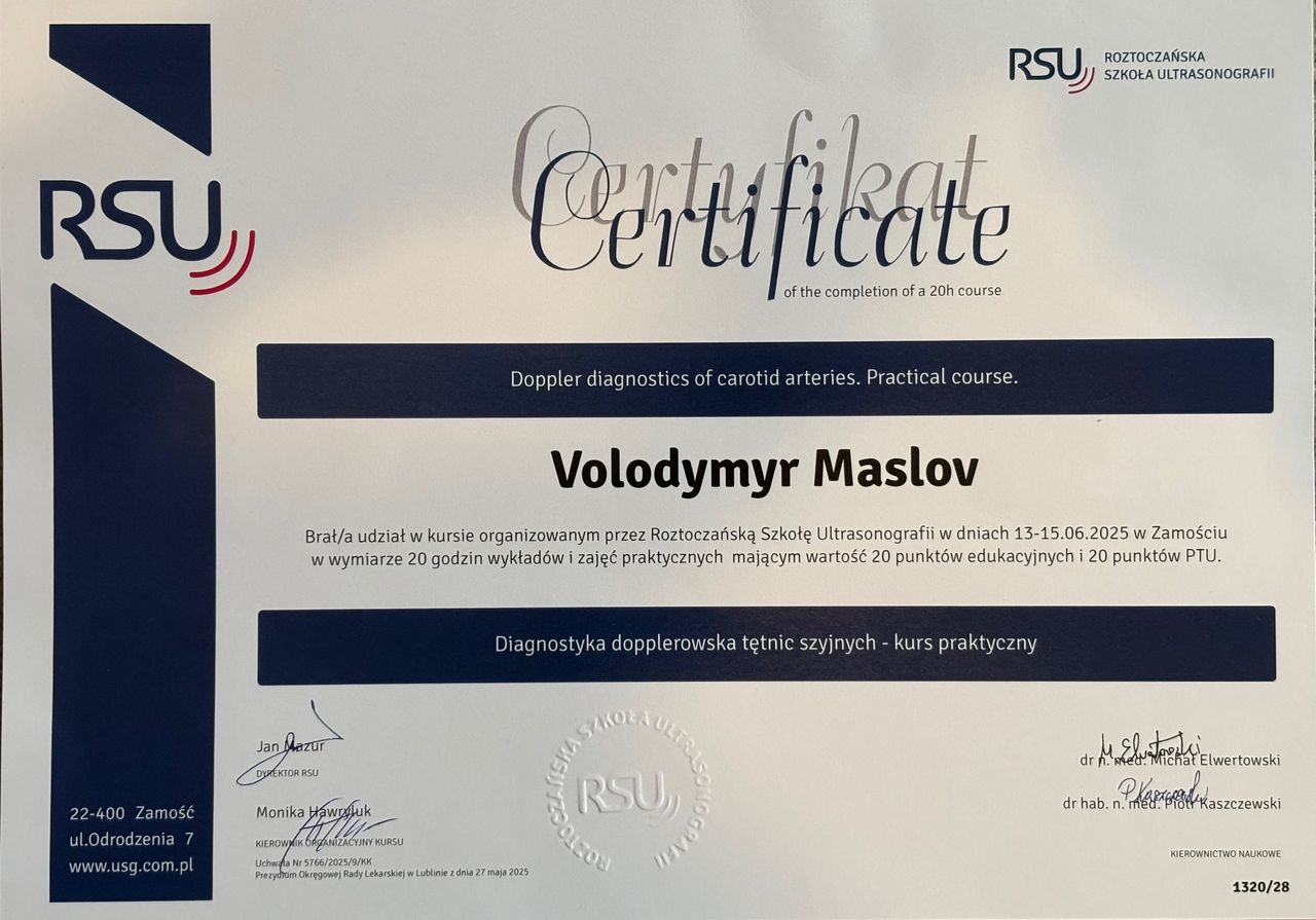 Jestem lekarzem specjalizującym się w flebologii. Posiadam wieloletnie doświadczenie kliniczne zdobyte zarówno w wojskowym szpitalu, jak i w prywatnych klinikach na Ukrainie. Zajmuję się diagnostyką i leczeniem chorób żył, takich jak żylaki kończyn dolnych, zakrzepica żył głębokich, przewlekła niewydolność żylna czy pajączki naczyniowe. Stosuję nowoczesne, małoinwazyjne metody leczenia – m.in. skleroterapię, laserowe zamykanie naczyń oraz diagnostykę USG Doppler. Regularnie poszerzam swoją wiedzę, uczestnicząc w szkoleniach i konferencjach z zakresu flebologii i chirurgii naczyniowej.