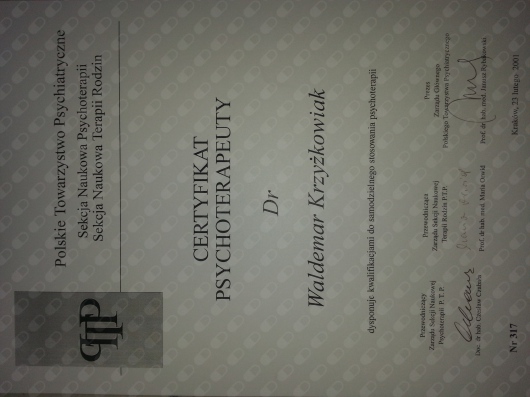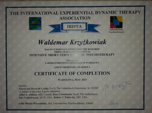 * posiada międzynarodowy certyfikat psychoterapeuty ISTDP (intensywna krótkoterminowa terapia psychodynamiczna) wydany przez International Experiential Dynamic Therapy Association,