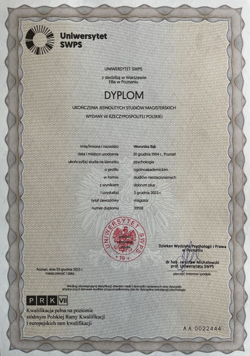 Ukończyłam studia magisterskie na kierunku psychologii na Uniwersytecie SWPS w Poznaniu. Jestem w trakcie szkolenia psychoterapeutycznego w nurcie integracyjnym w Wielkopolskim Instytucie Psychoterapii. Pracuję z osobami dorosłymi — stacjonarnie i online. Działam zgodnie z Kodeksem Etycznym Psychologa, zapewniając poufność.