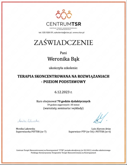 Pani Weronika jest osobą bardzo wnikliwą i inteligentną tym samym szybko znajduje powiązania, na które samemu byłoby niemożliwym wpaść. Zdecydowanie polecam terapię.