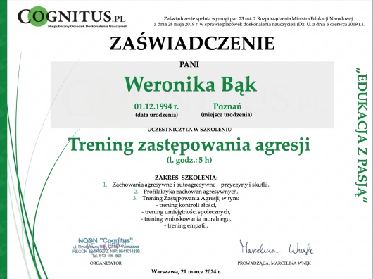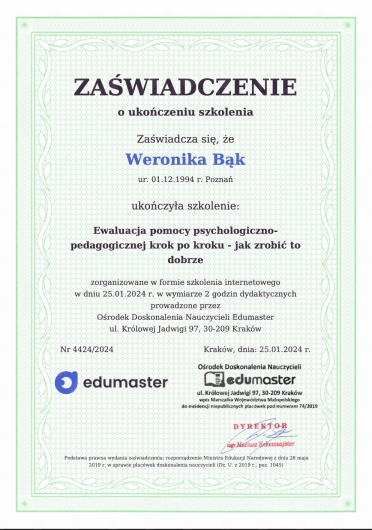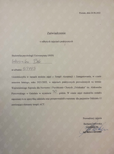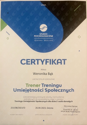 Pani Weronika jest wspaniałym Psychologiem, miła atmosfera, czułam się dobrze,już na pierwszym spotkaniu. Zawsze czuje się wysłuchana, zrozumiana, a co najważniejsze terapia przynosi efekty, widzę bardzo dużą zmianę w swoim zachowaniu, w swoim myśleniu itp.
