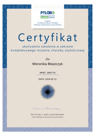 Nazywam się Weronika Błaszczyk, jestem lekarzem rodzinnym oraz edukatorką w zakresie zdrowia, w tym zarządzania masą ciała i zdrowego stylu życia. Uważam, że specjalizacja z tego zakresu daje możliwość holistycznego podejścia do Pacjenta, gdzie odsyłanie do innego specjalisty powinno stanowić ostateczność. Na co dzień w swojej praktyce lekarskiej przyjmuje zarówno dorosłych jak i dzieci. Ukończyłam Gdański Uniwersytet Medyczny. Prowadzę profil na Instagramie dr_simplemedicine, na którym dzielę się z moimi obserwatorami wiedzą i doświadczeniem, budując społeczność skupioną na dbaniu o zdrowie w sposób naukowy, a zarazem przyjazny. Obecnie pracuje jako lekarz rodzinny w placówce Nasz Lekarz oraz przeprowadzam konsultację online.