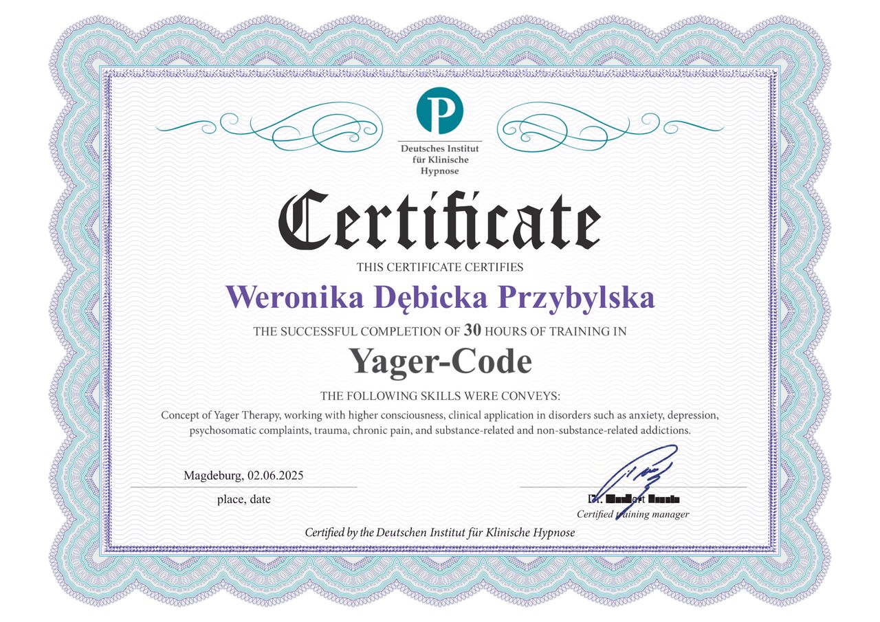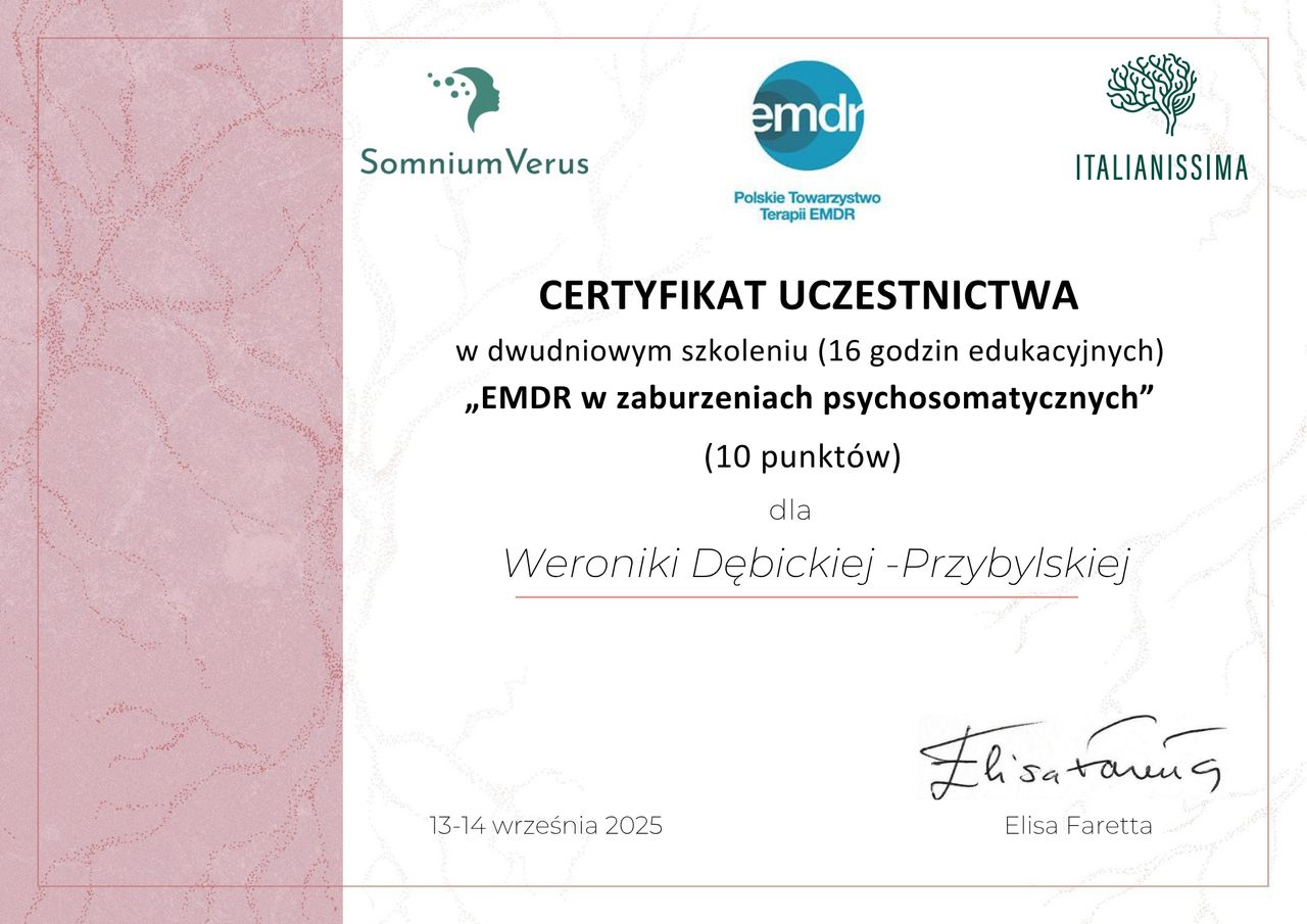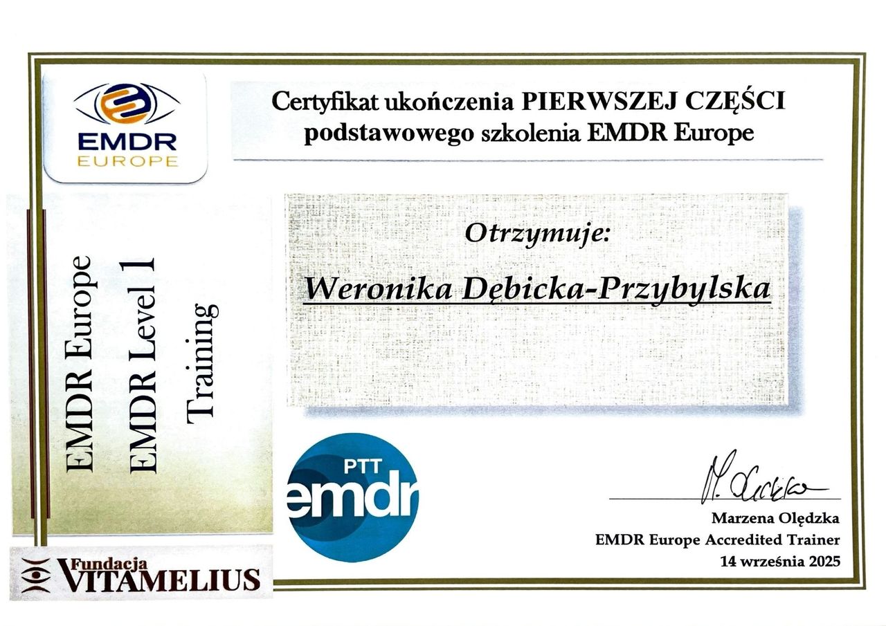Mam szkolenia z hipnozy klinicznej, terapii dr Yagera, Terapii Skoncentrowanej na Rozwiązaniach, EMDR poziom 1 oraz EMDR w zaburzeniach psychosomatycznych.