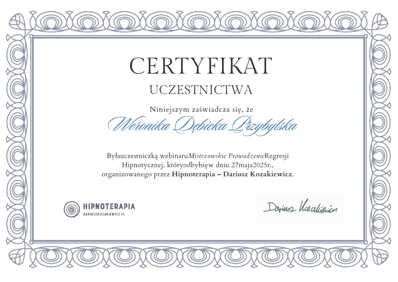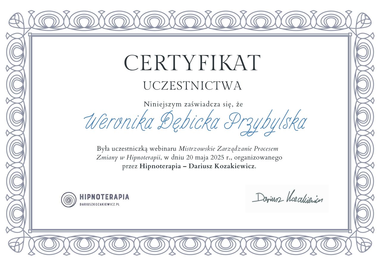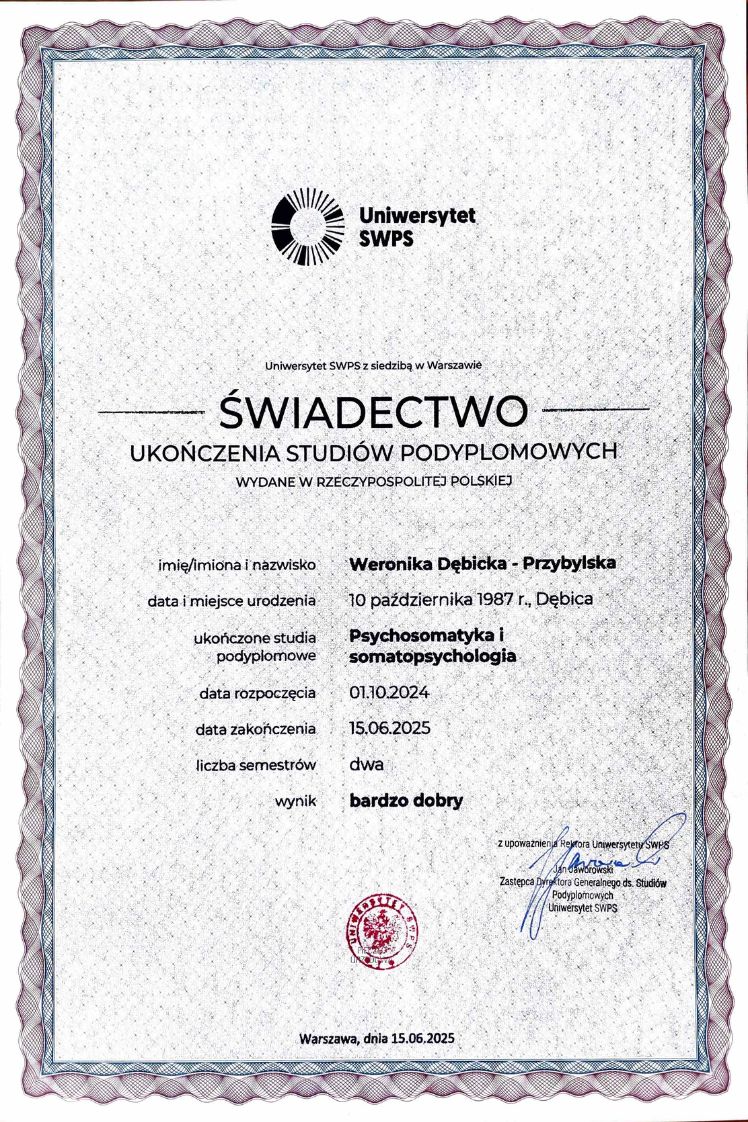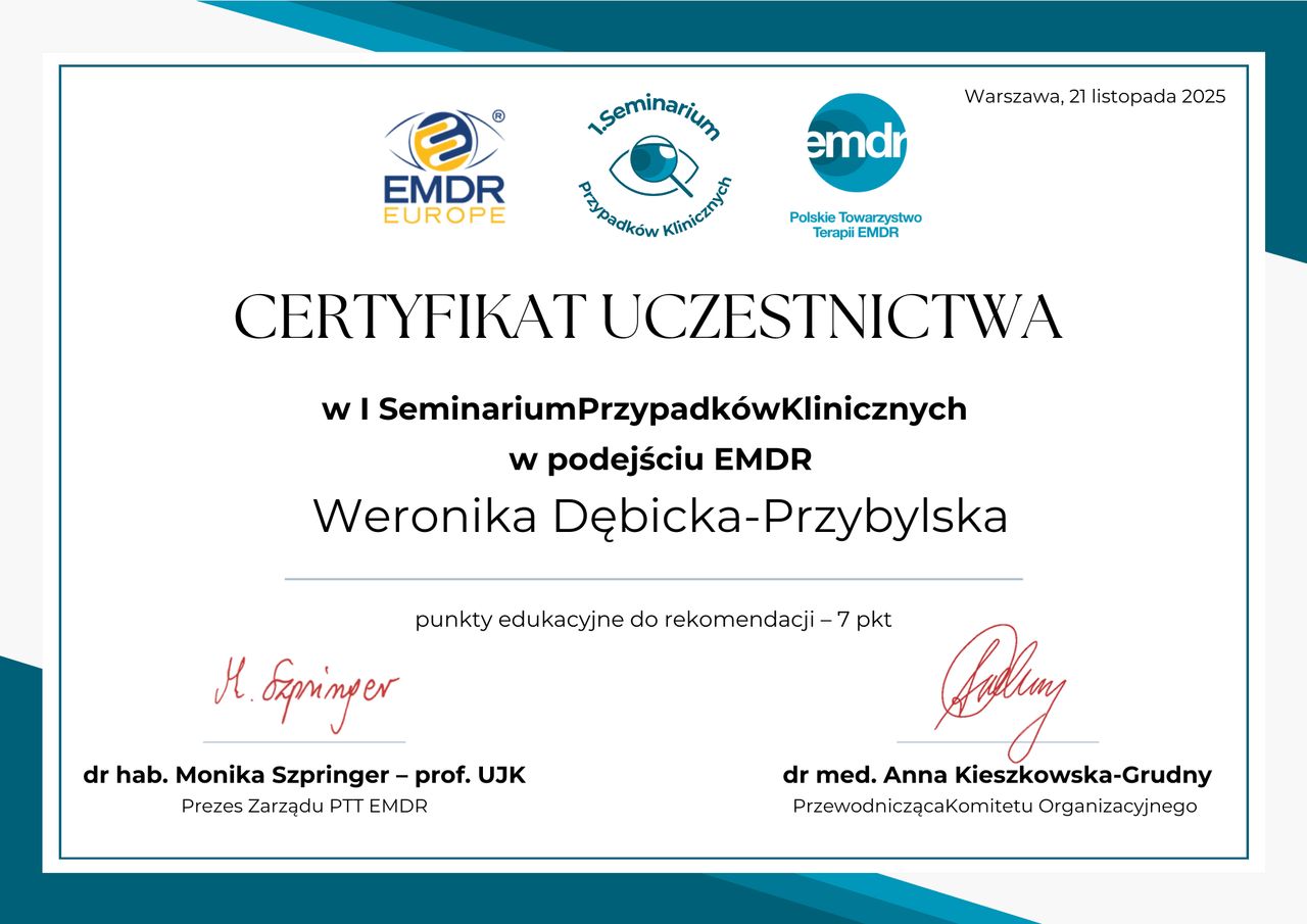 Mam szkolenia z hipnozy klinicznej, terapii dr Yagera, Terapii Skoncentrowanej na Rozwiązaniach, EMDR poziom 1 oraz EMDR w zaburzeniach psychosomatycznych.