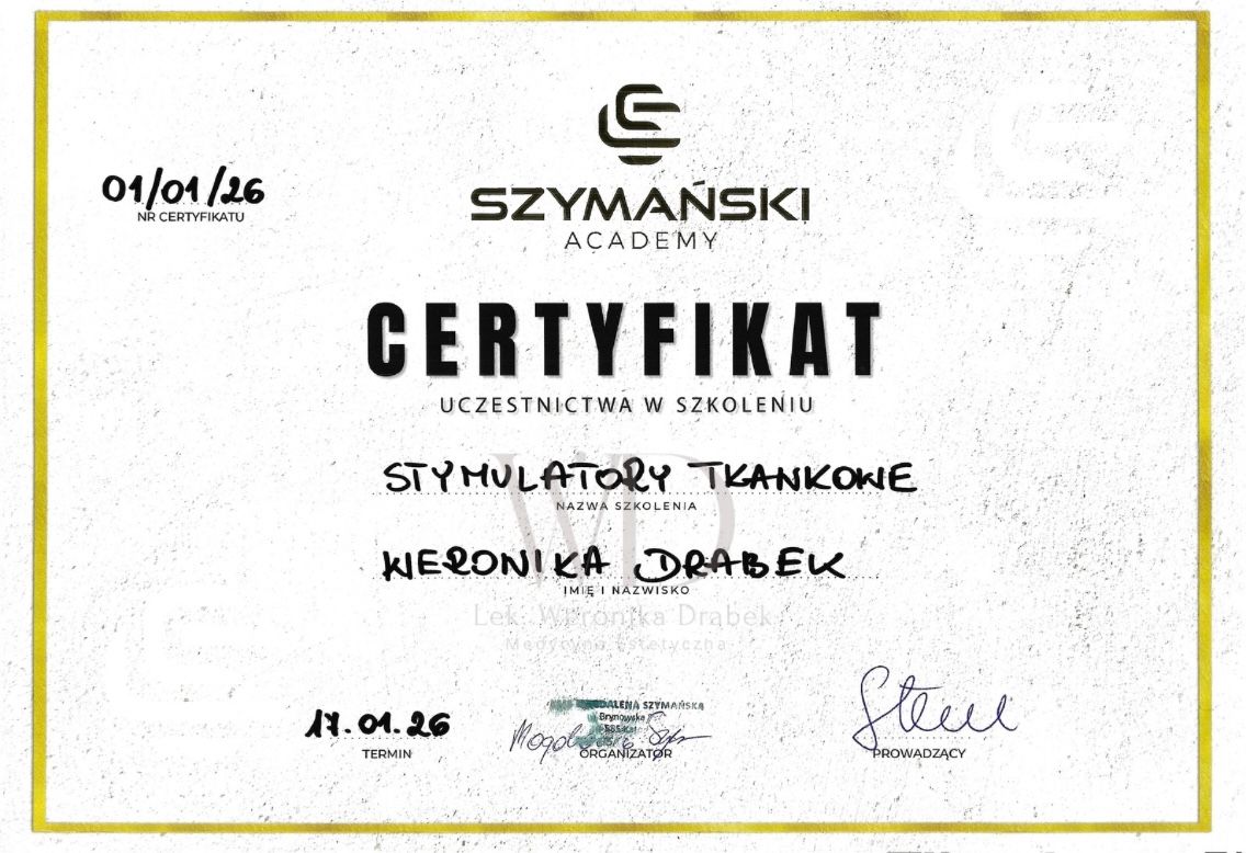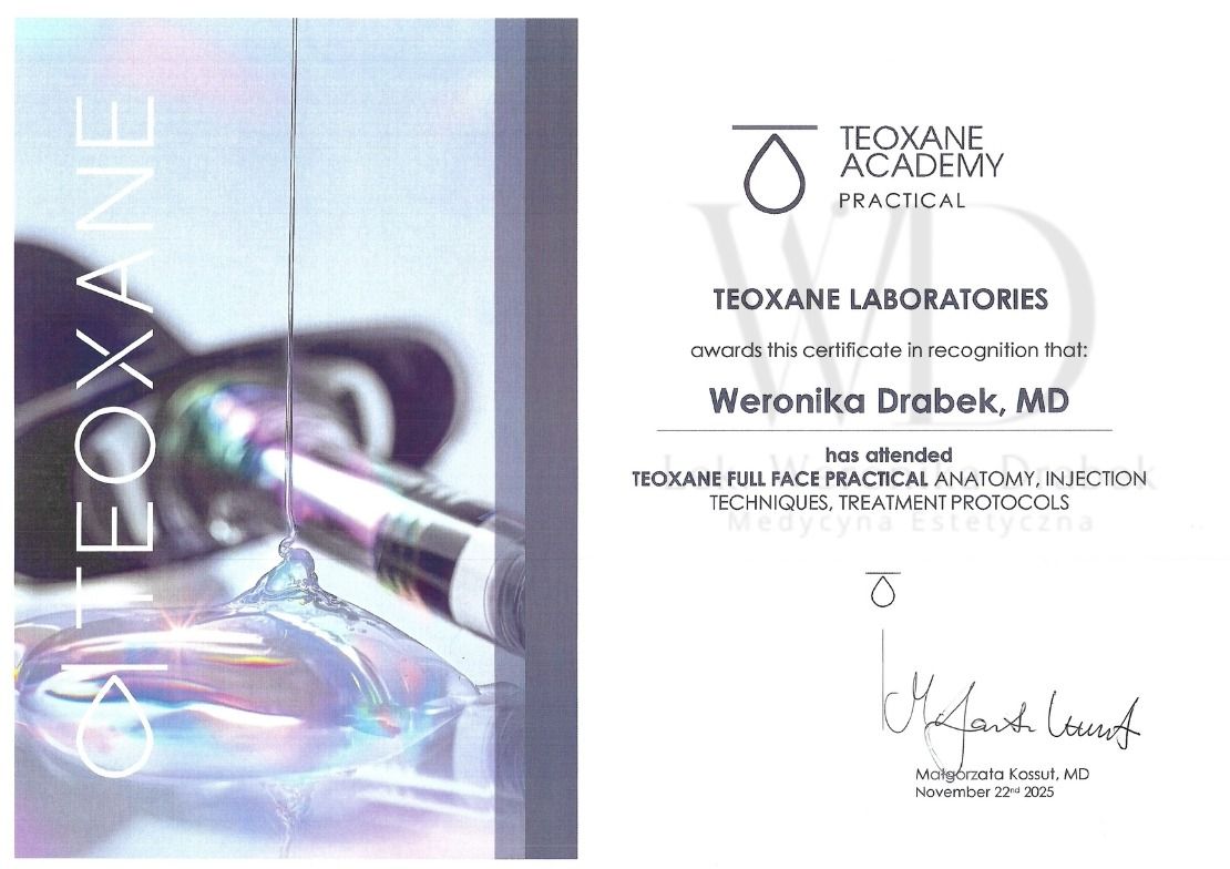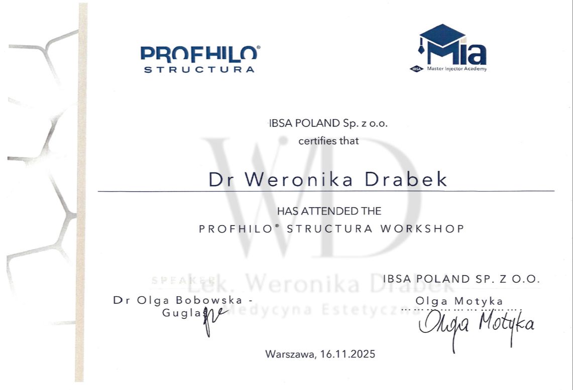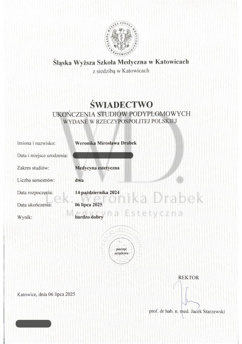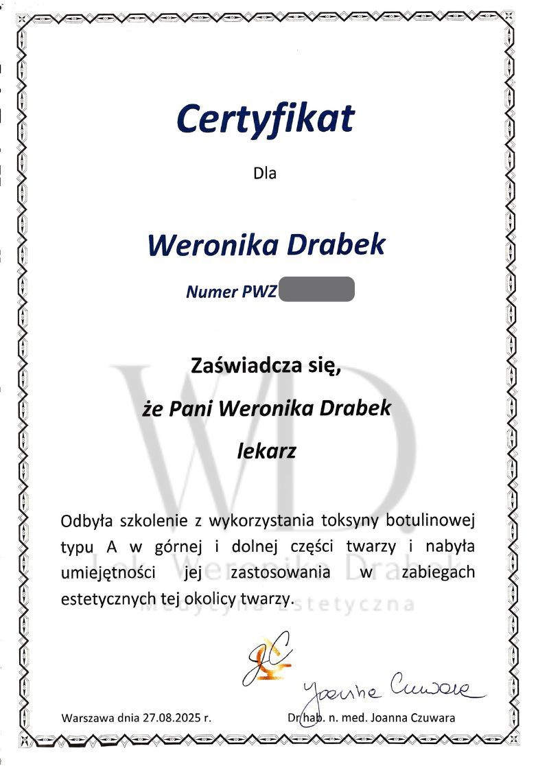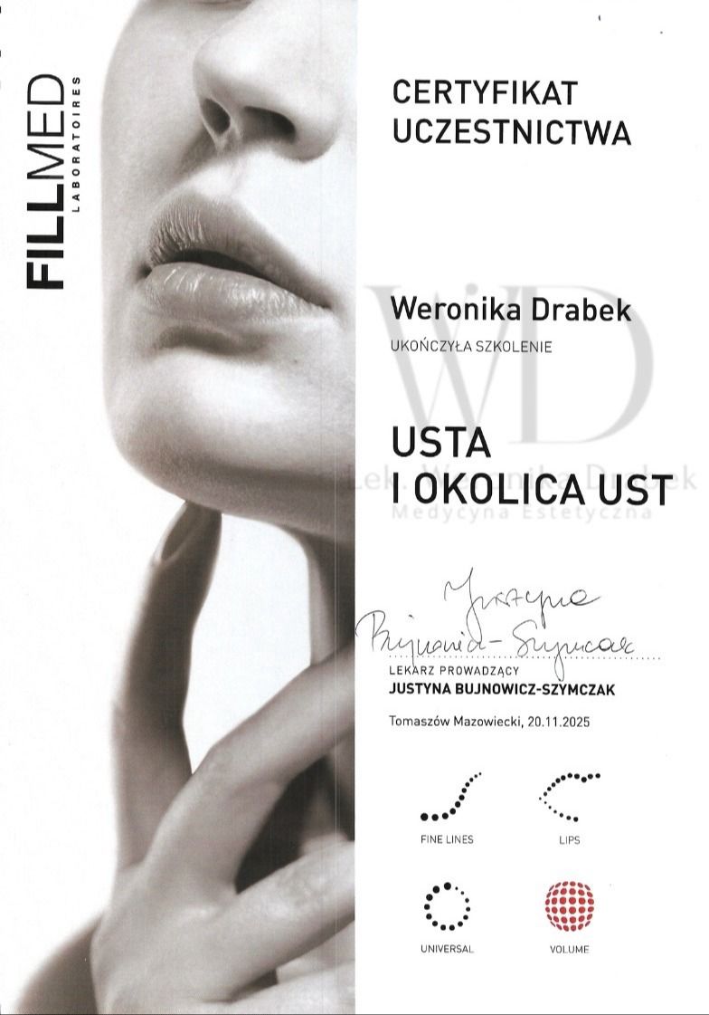 Jestem dyplomowanym lekarzem medycyny estetycznej. Ukończyłam kierunek lekarski oraz roczne studia podyplomowe z medycyny estetycznej, co pozwala mi na holistyczne i bezpieczne prowadzenie terapii. Od tego czasu nieustannie rozwijam swoje kompetencje, regularnie uczestnicząc w licznych, certyfikowanych szkoleniach, by oferować pacjentom najnowsze i najbezpieczniejsze metody leczenia.