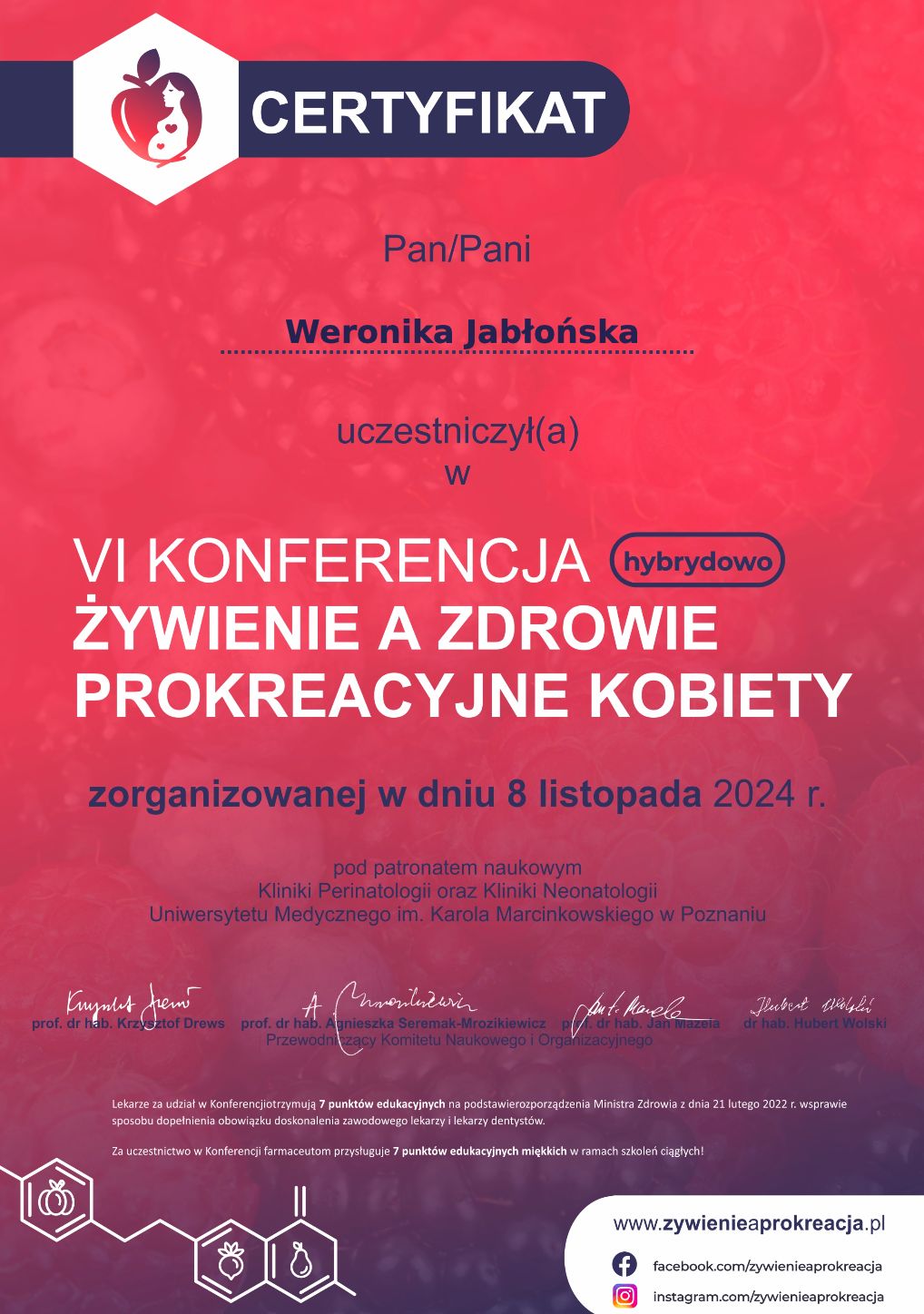 Jestem w trakcie kursu na koordynatora ds. zdrowia prokreacyjnego i nieustannie poszerzam swoją wiedzę, uczestnicząc w licznych specjalistycznych szkoleniach z zakresu dietetyki klinicznej, endokrynologii i leczenia niepłodności.