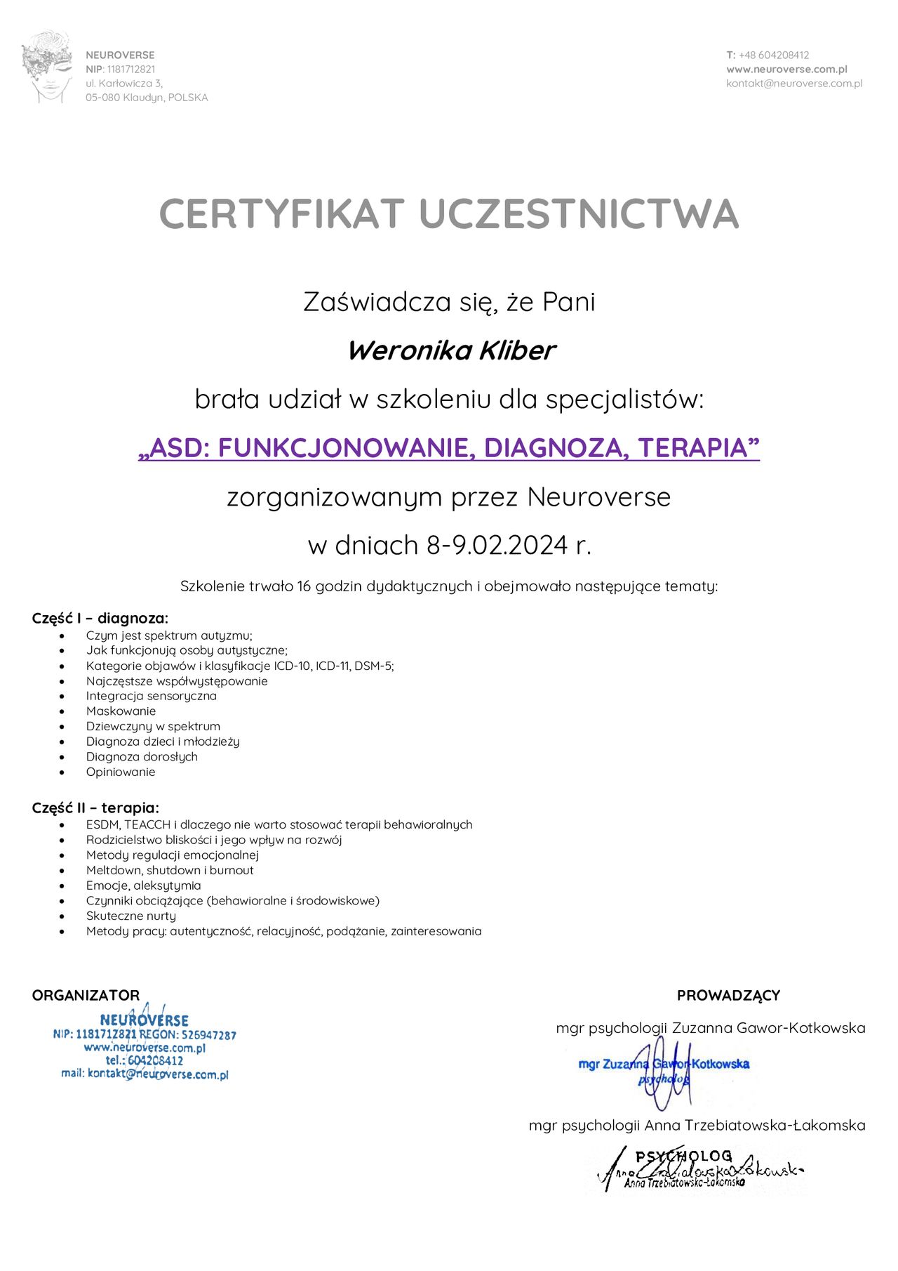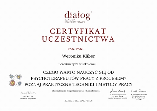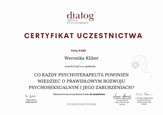 Zależy mi na tym, aby być jak najlepszym terapeutą dlatego też biorę udział w licznych szkoleniach i webinariach.