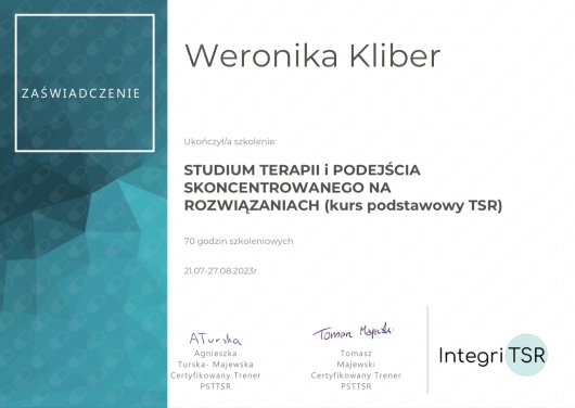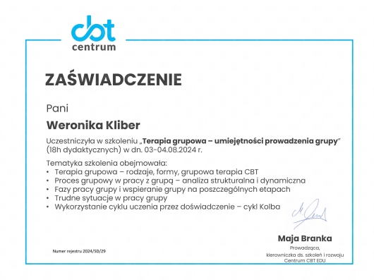 Jestem psychologiem oraz psychoterapeutką poznawczo-behawioralną w trakcie czteroletniego szkolenia na Uniwersytecie SWPS. Psychologię ze specjalnością kliniczną człowieka dorosłego oraz zdrowia i jakości życia ukończyłam na Uniwersytecie Śląskim w Katowicach. Odbyłam również certyfikowany kurs z Racjonalnej Terapii Zachowania oraz I stopień certyfikowanego szkolenia z Terapii Skoncentrowanej na Rozwiązaniach w Integri TSR.