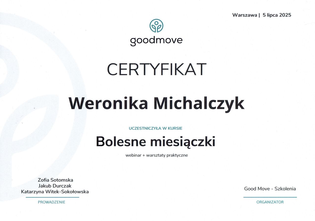 Cieszę się, że na swoją pierwszą wizytę fizjoterapeutyczną trafiłam do Pani Weroniki! Od pierwszej chwili czułam, że trafiłam do odpowiedniej osoby z ogromną wiedzą. Pani Weronika przeprowadziła ze mną dokładny wywiad, rozwiała wszelkie wątpliwości odnośnie moich dolegliwości i poinstruowała w jaki sposób mogę ćwiczyć w domu. Jest osobą przemiłą, bardzo empatyczną, skupioną na pacjencie i niezwykle profesjonalną. Całość wizyty przebiegła w bardzo miłej i komfortowej atmosferze, a ja czułam się bardzo zaopiekowana. Zdecydowanie polecam i na pewno wrócę na kolejną wizytę!