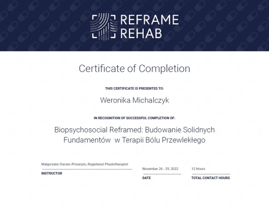 • Budowanie solidnych fundamentów w terapii bólu przewlekłego – Reframe Rehab, Małgorzata Starzec-Proserpio (2022; 2024)