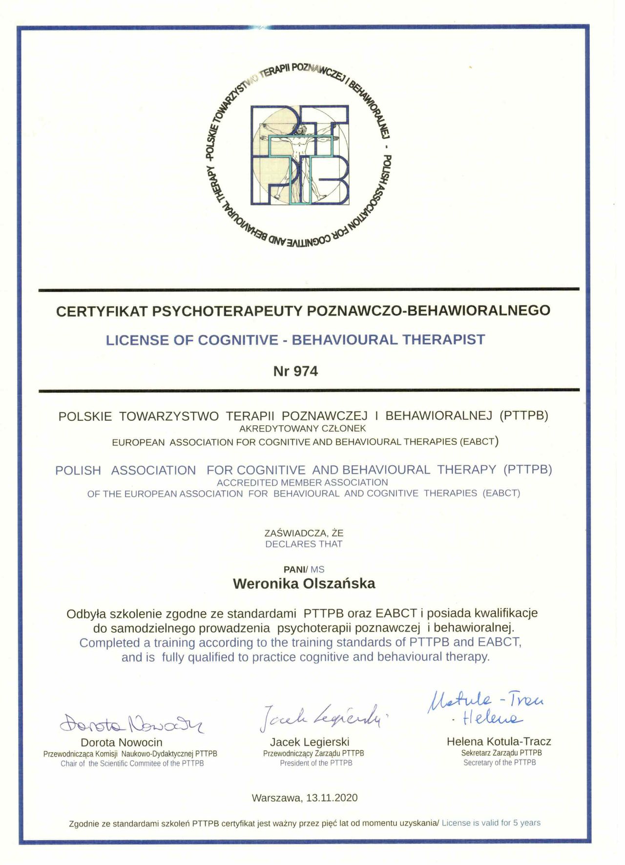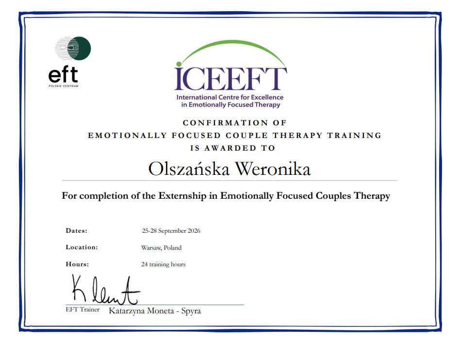 Ukończyłam Psychologię na Uniwersytecie Jagiellońskim. Jestem członkiem Polskiego Towarzystwa Terapii Poznawczo-Behawioralnej (PTTPB). Ukończyłam czteroletnie szkolenie w TER-COGNITIVA (Centrum Terapeutyczno-Szkoleniowe) gdzie uzyskałam Certyfikat Psychoterapeuty Poznawczo-Behawioralnego PTTPB nr 974. Korzystam z regularnej superwizji terapeutów nurtu CBT.