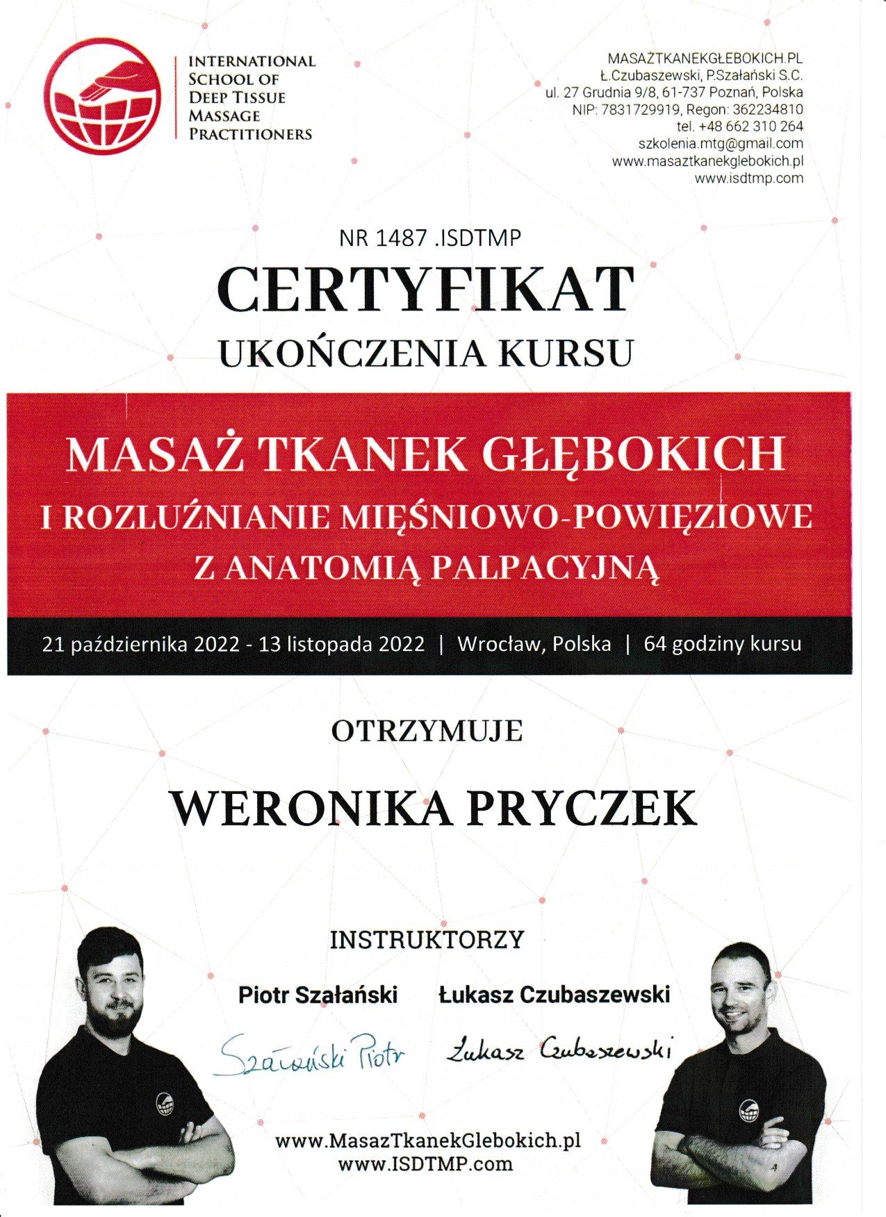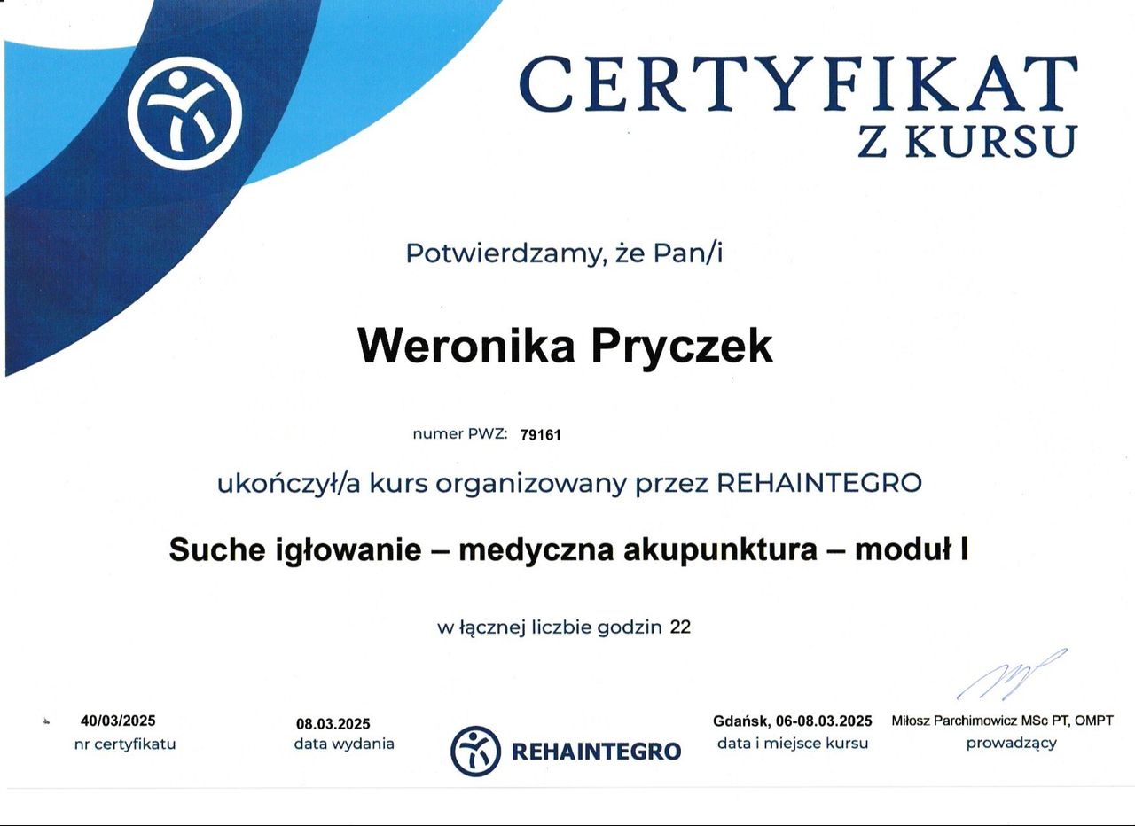 Jaki jest zakres porad oferowanych przez Weronika Pryczek?Weronika Pryczek to fizjoterapeuta. Na podstawie swojego doświadczenia i wykształcenia Weronika Pryczek oferuje usługi takie jak: konsultacja fizjoterapeutyczna, terapia wad postawy, Terapia blizny, Masaż leczniczy, masaż sportowy, Drenaż limfatyczny, trening funkcjonalny.