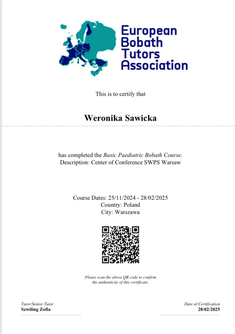 Jestem absolwentką Akademii Wychowania Fizycznego w Warszawie na kierunku fizjoterapia, który ukończyłam w 2022 roku. Od tamtej pory pracuje w Centrum Zdrowia Dziecka w Warszawie, w którym zdobywam doświadczenie.