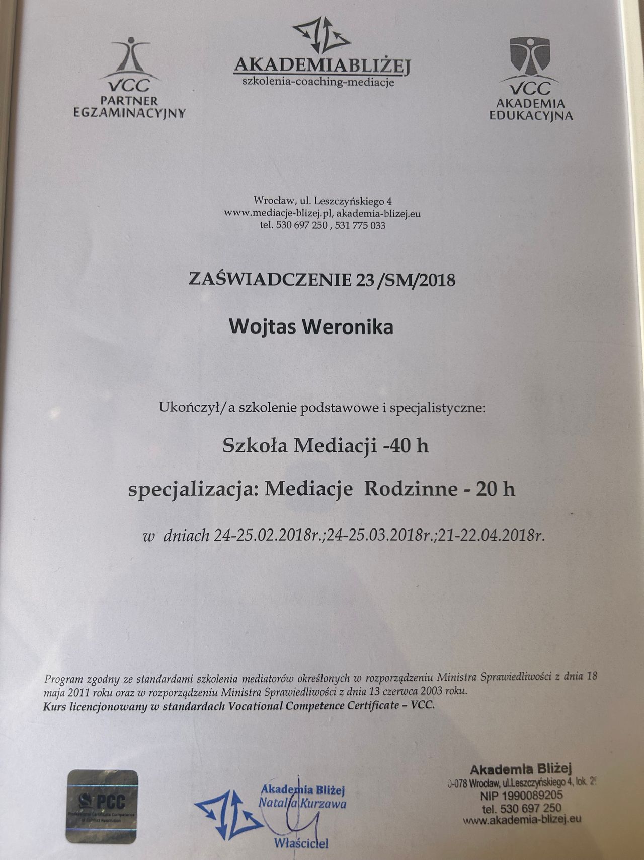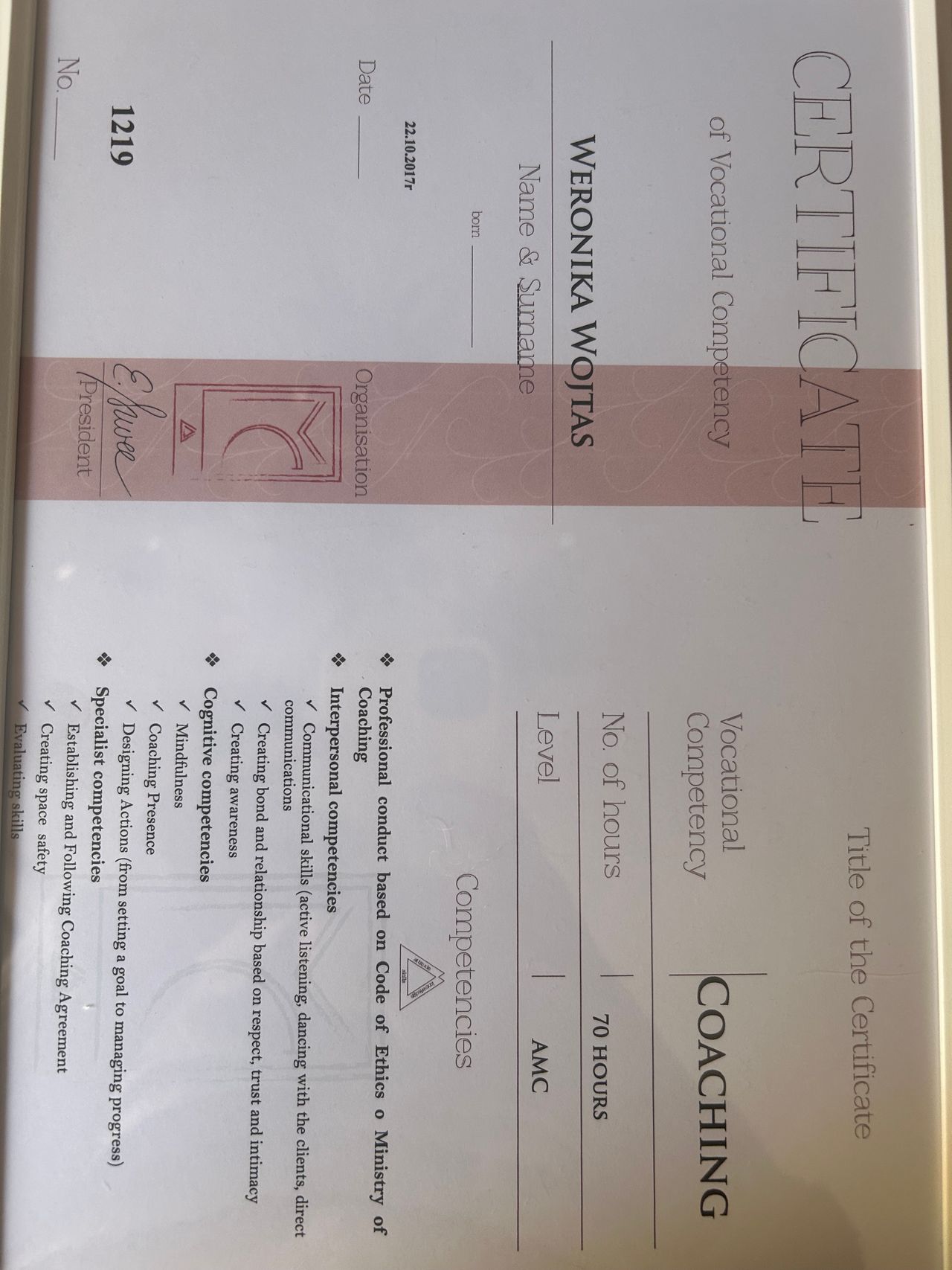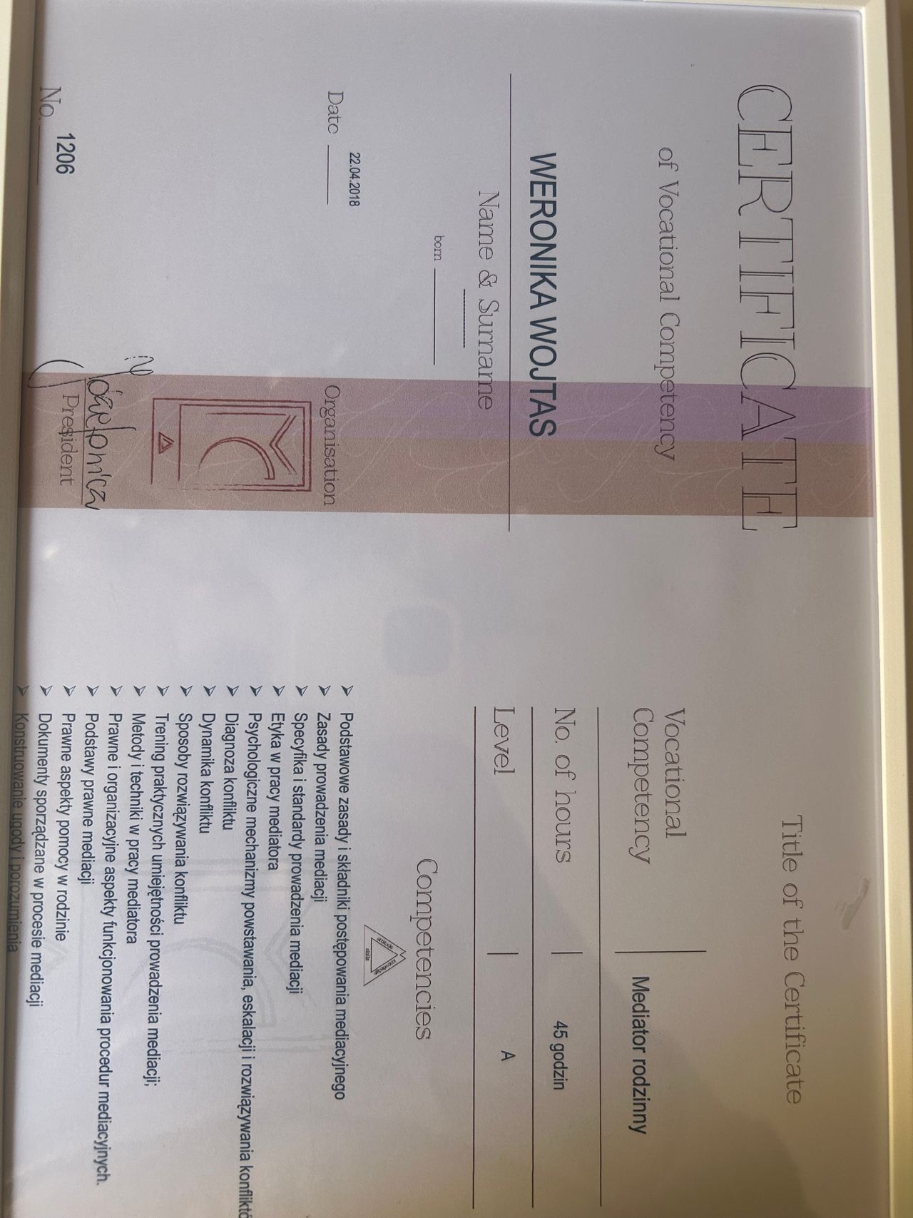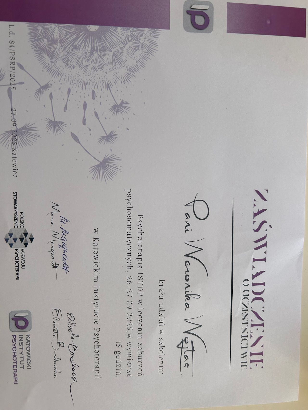 Kiedy podchodziłem do drzwi gabinetu, wahałem się czy wejść, nie wiedziałem czy nacisnąć na dzwonek. Bagaż problemów rodził wątpliwości. Po prawie godzinie rozmowy, rad, wskazówek p. Weroniki, cierpliwego słuchania, zainteresowania moimi problemami, wychodziłem z podniesiona głową i z usmiechem. Jeśli ktoś waha się z wyborem odpowiedniego specjalisty to gorąco polecam p. Weronike. To była moja pierwsza wizyta ale na pewno nie ostatnia.