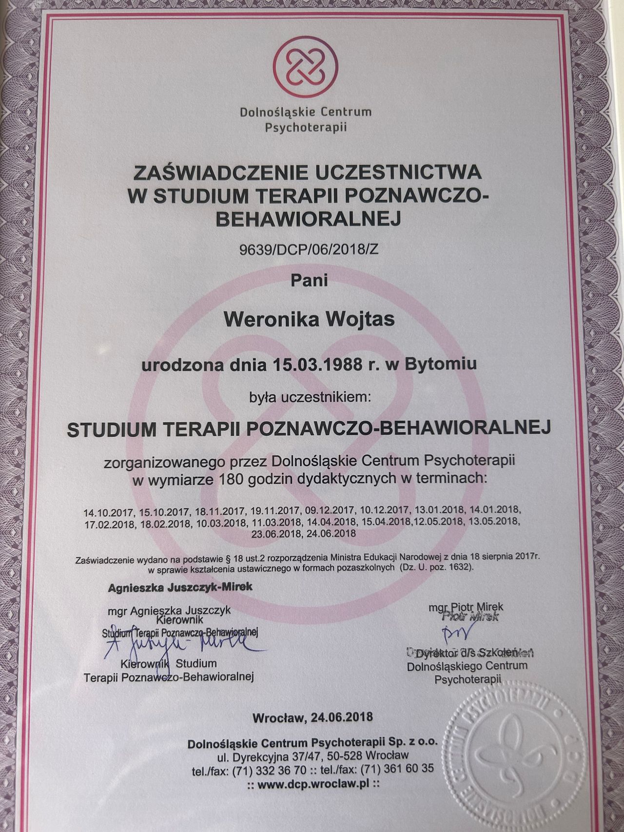 Serdecznie polecam Panią Weronikę jako terapeutkę. Na każdej wizycie czułam się swobodnie i bezpiecznie by móc dzielić się swoją historią i czasami nieco trudniejszymi wspomnieniami. Panią Weronikę cechuje również duża empatia oraz profesjonalizm z jakim podchodzi do swojej pracy. Niedawno zakończyłam swoją terapię, ale wiem, że gdy tylko będę czuła taką potrzebę to na pewno wrócę do tego gabinetu. Jeszcze raz serdecznie polecam!