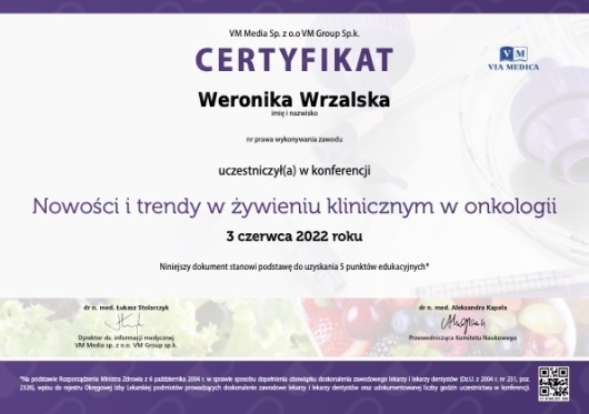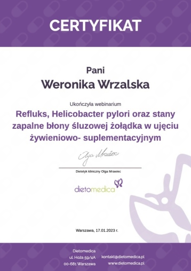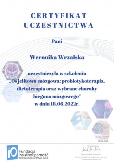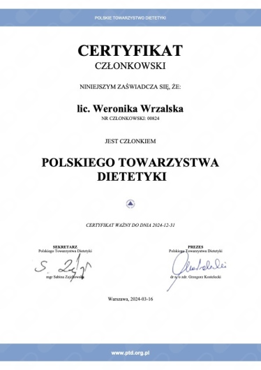 Jestem absolwentką studiów dietetycznych i członkiem Polskiego Towarzystwa Dietetyków. Swoją wiedzę regularnie pogłębiam poprzez udział w renomowanych szkoleniach, kursach i konferencjach dietetycznych.