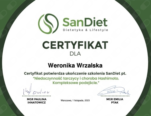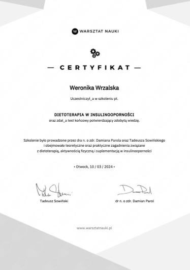Bardzo polecam panią Weronikę jako dietetyka! Trafiłam do niej z problemem PCOS i już po kilku tygodniach stosowania diety zauważyłam ogromną poprawę. Pani Weronika podeszła do mnie indywidualnie, uwzględniając moje potrzeby i preferencje żywieniowe. Wszystko dokładnie wytłumaczyła i wspierała na każdym etapie procesu. Dzięki jej wiedzy i zaangażowaniu czuję się znacznie lepiej, a moje wyniki również się poprawiły. Gorąco polecam każdemu, kto szuka wsparcia dietetycznego w problemach hormonalnych i nie tylko!