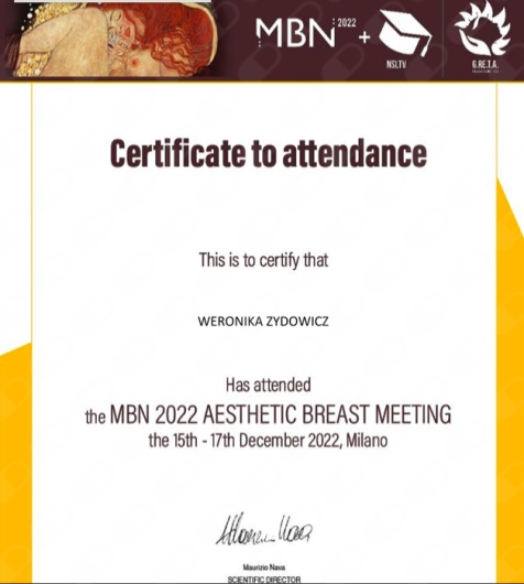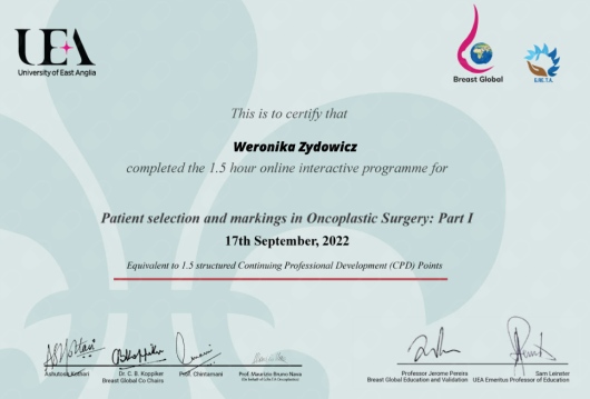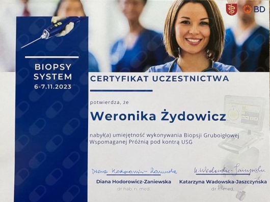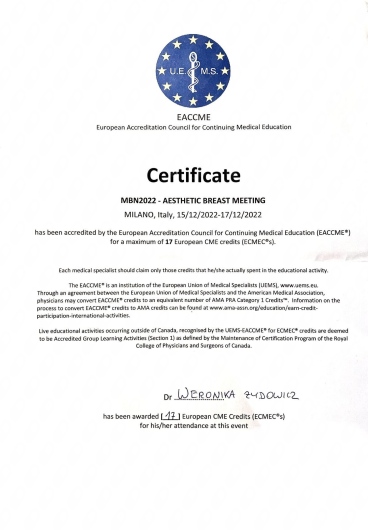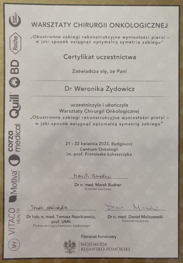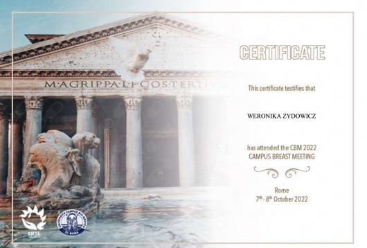 Od czasów studenckich interesuję się chirurgią, będąc aktywnym asystentem podczas zabiegów z zakresu chirurgii ogólnej, plastycznej oraz onkologicznej. Swoją wiedzę pogłębiam podczas wymian międzyszpitalnych, m.in. w Zachodniopomorskim Centrum Onkologicznym w Szczecinie, oraz na szkoleniach, takich jak Warsztaty Chirurgii Onkologicznej organizowane w Centrum Onkologii w Bydgoszczy pod opieką dr. Marka Budnera, a także szkolenie z biopsji gruboigłowej pod kontrolą USG w Centrum Onkologii w Krakowie pod opieką dr. Diany Hodorowicz-Zaniewskiej. Byłam uczestniczką zagranicznych konferencji, m.in. CBM Campus Breast Meeting oraz MBN Aesthetic Breast Meeting, organizowanych we Włoszech.