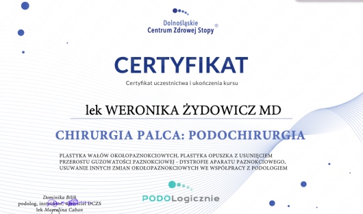 W Dolnośląskim Centrum Zdrowej Stopy odbyłam szkolenie w zakresie podochirurgii, uzyskując tym samym certyfikat.