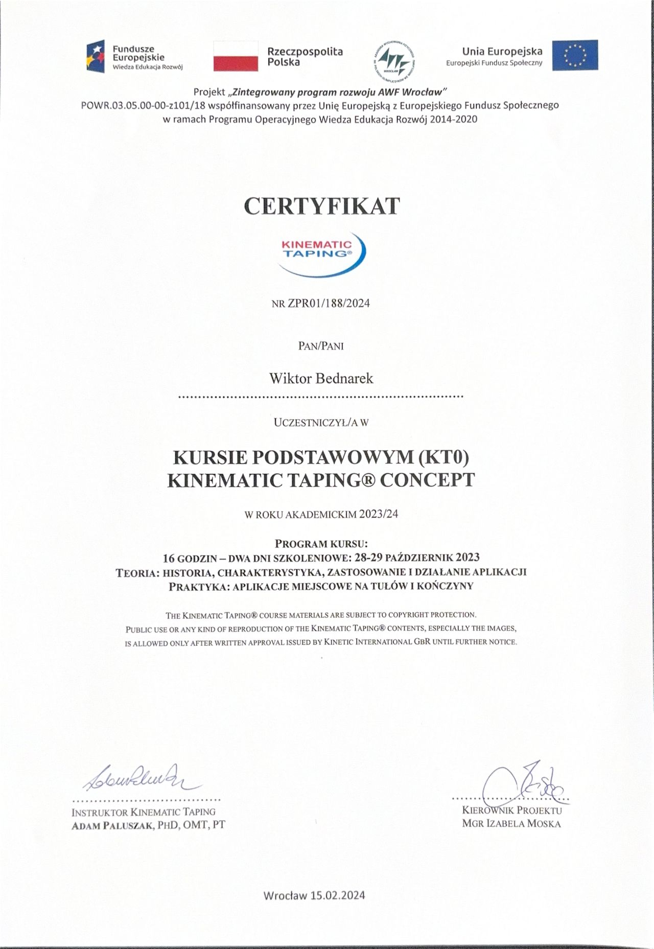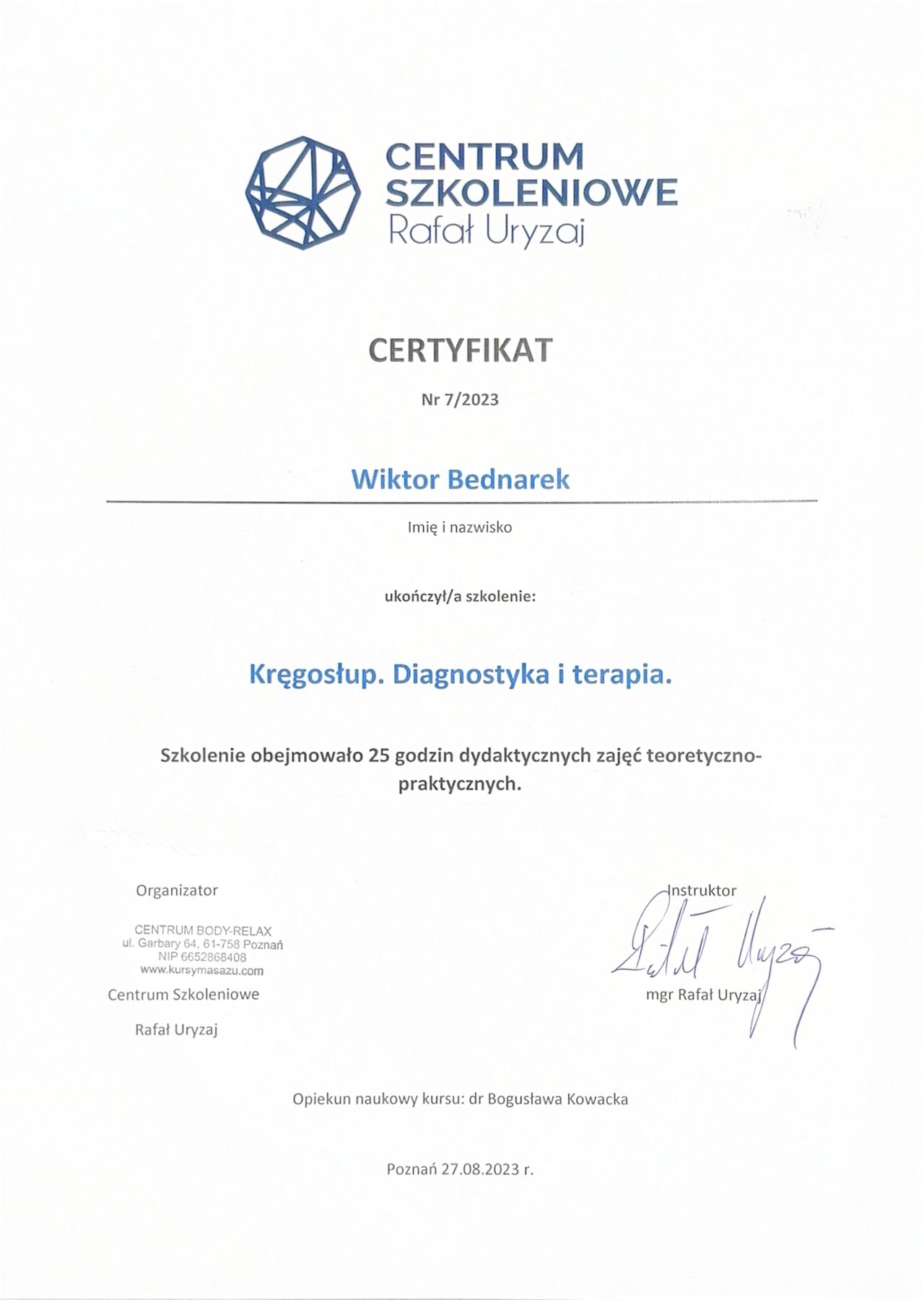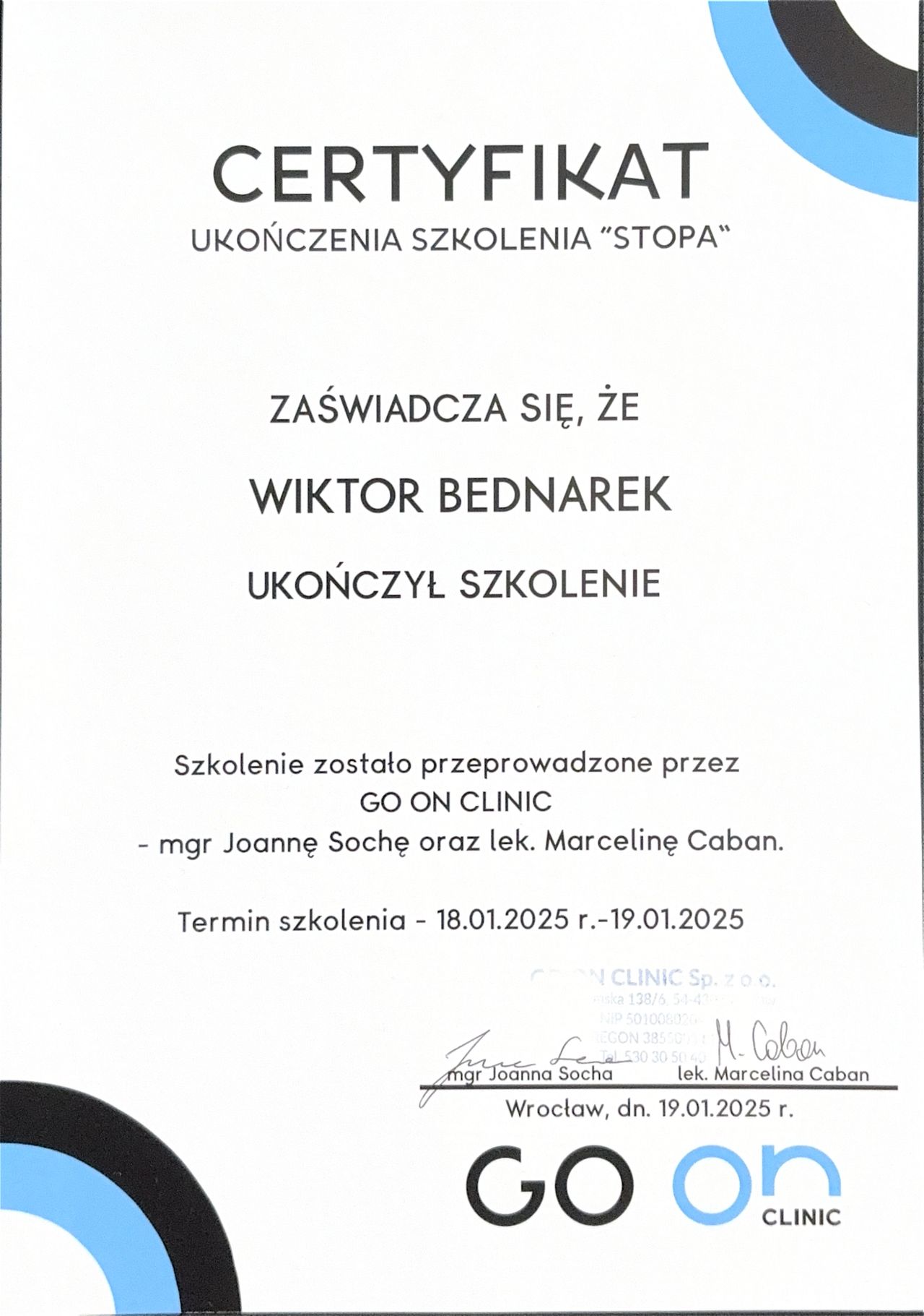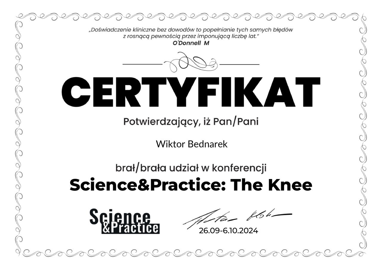 Pracuję w oparciu o aktualną wiedzę, stale doszkalam się na kursach i konferencjach z obszaru ortopedii, fizjoterapii ortopedycznej i treningu medycznego, a listę moich certyfikatów znajdziesz w zakładce “Certyfikaty”.