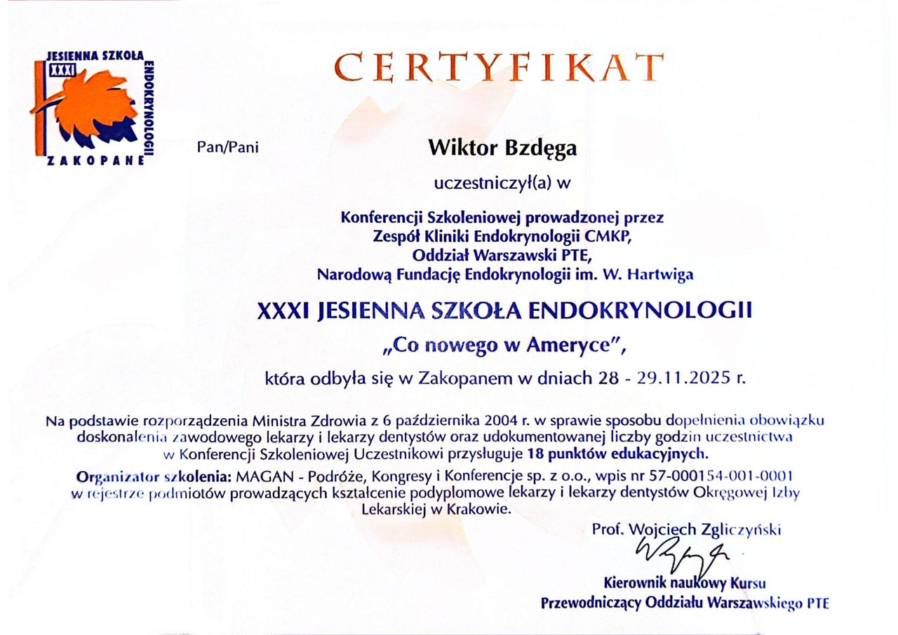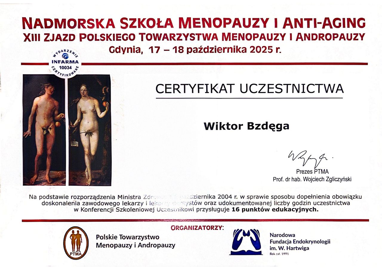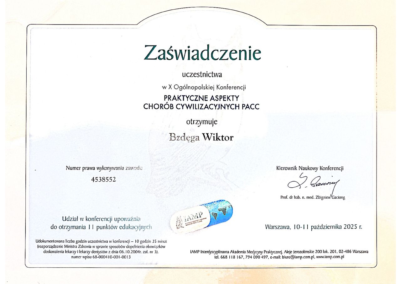Czy Wiktor Bzdęga przyjmuje online, bez konieczności pojawiania się w placówce?Tak, Wiktor Bzdęga oferuje konsultacje online. Wybierz opcję „konsultacja online” przy umawianiu wizyty, a zobaczysz dostępne terminy.