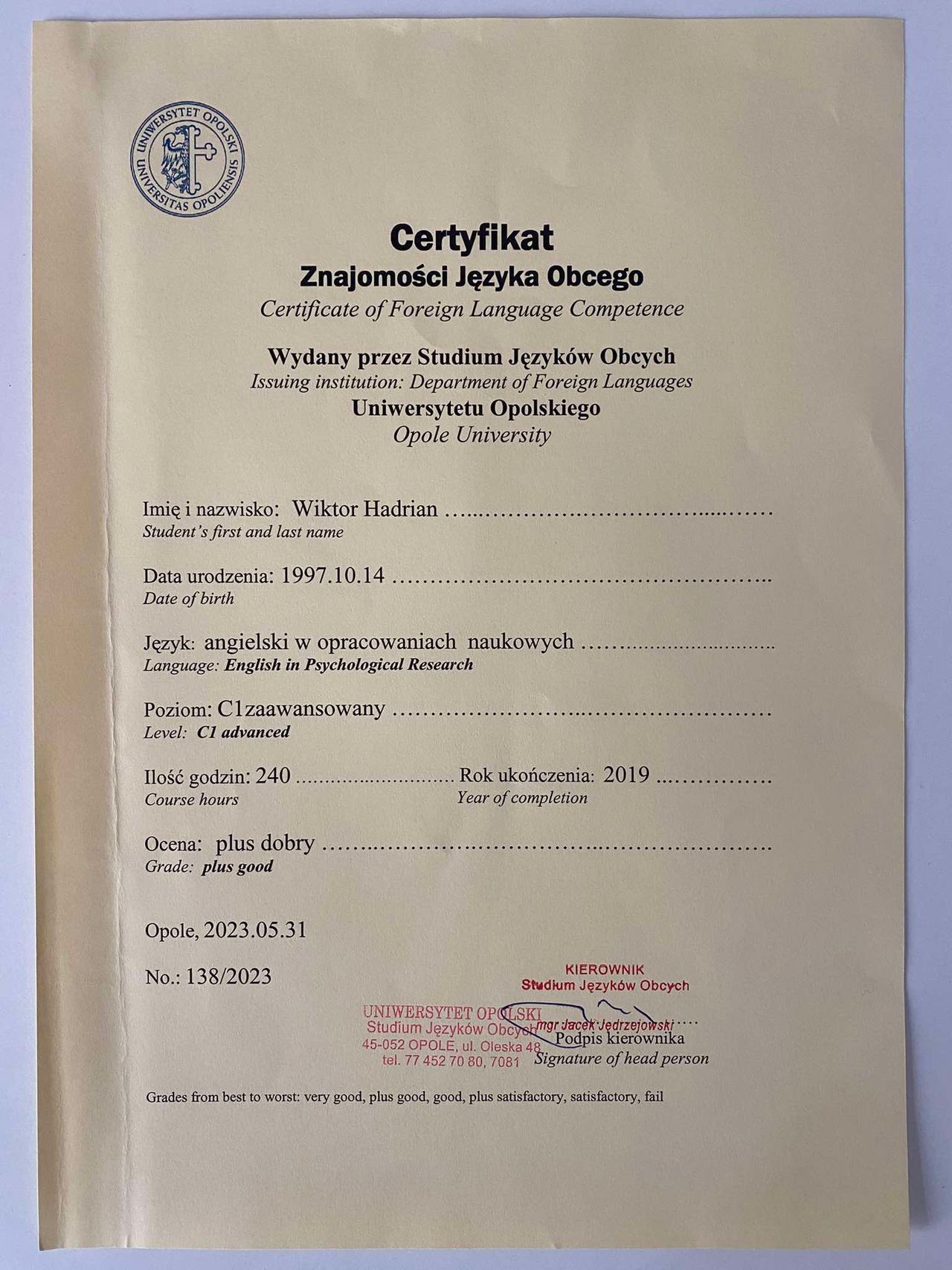 W jakich językach konsultuje Wiktor Hadrian?Języki, których używa Wiktor Hadrian to angielski, polski.